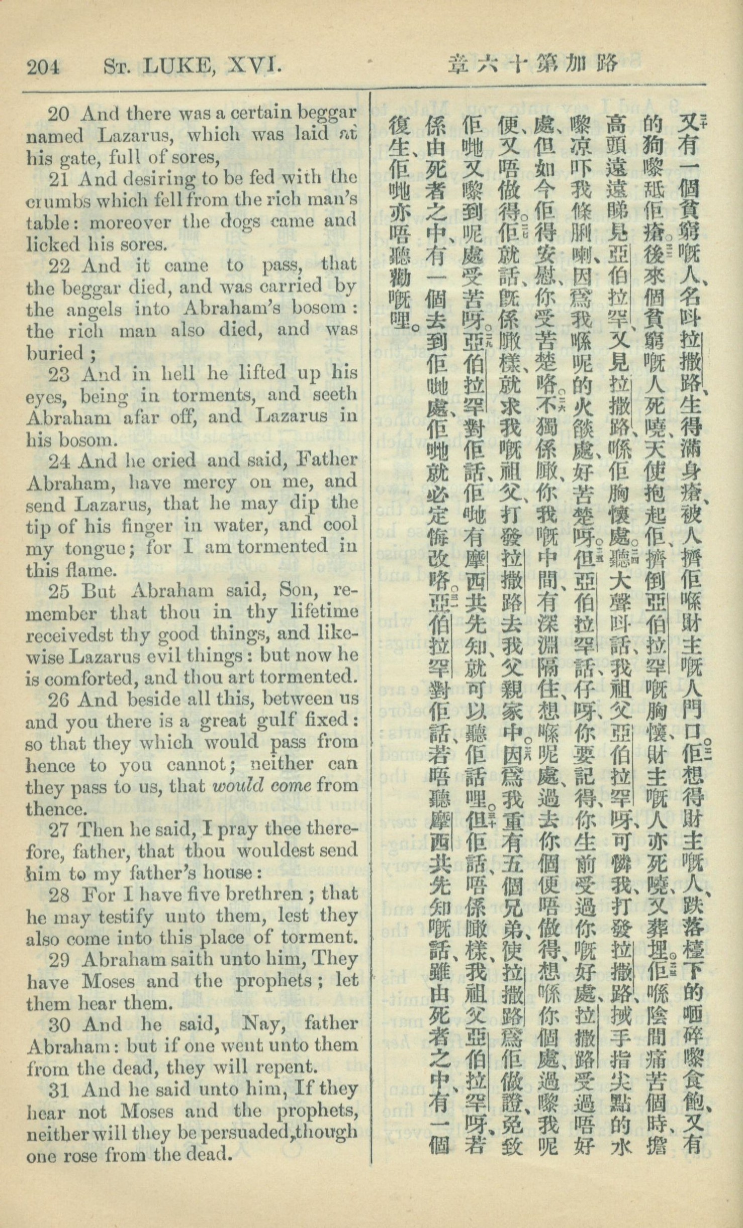 1909年中西字新約全書 路加福音 16 章 20 節到 16 章 31 節