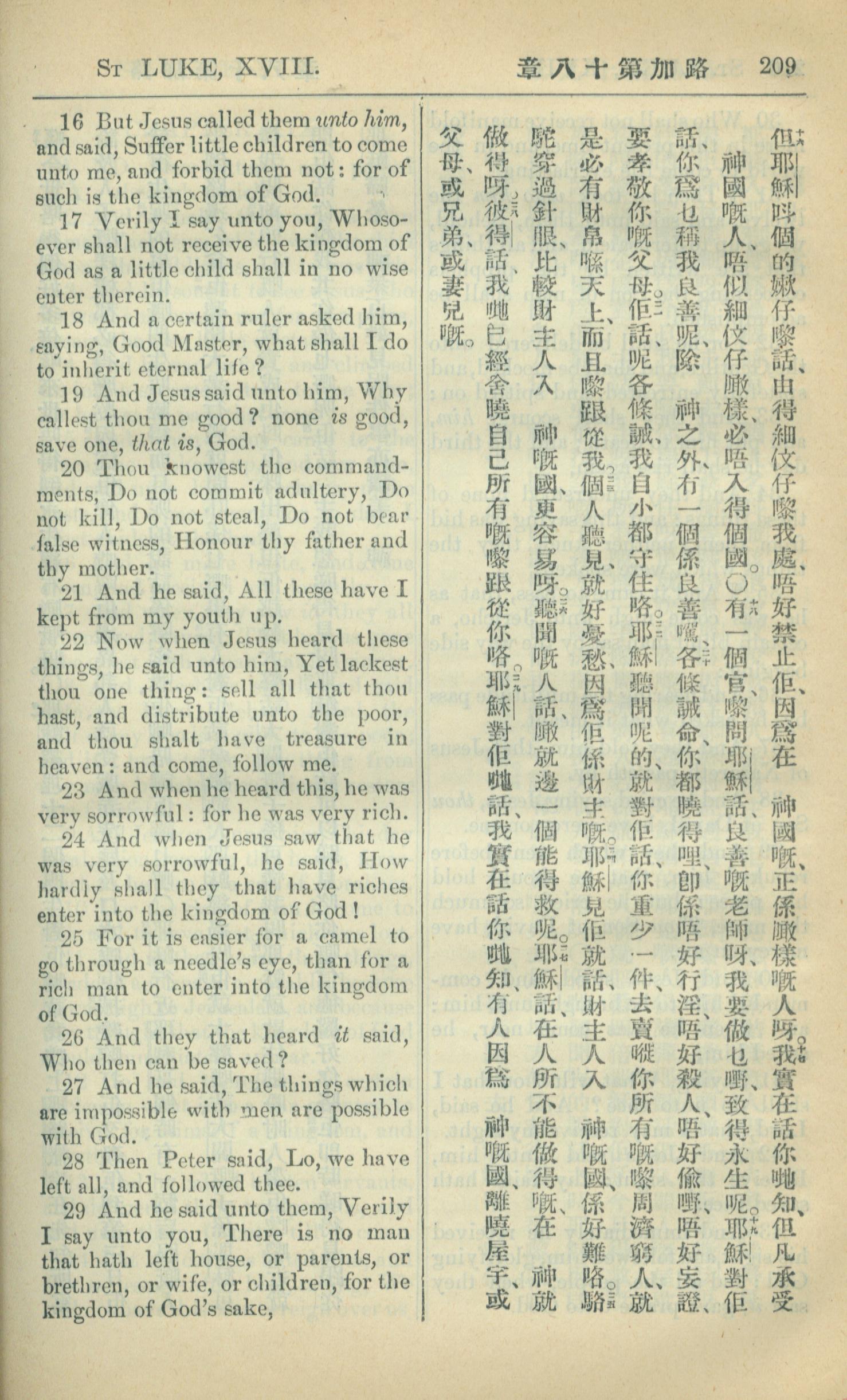 1909年中西字新約全書 路加福音 18 章 16 節到 18 章 29 節