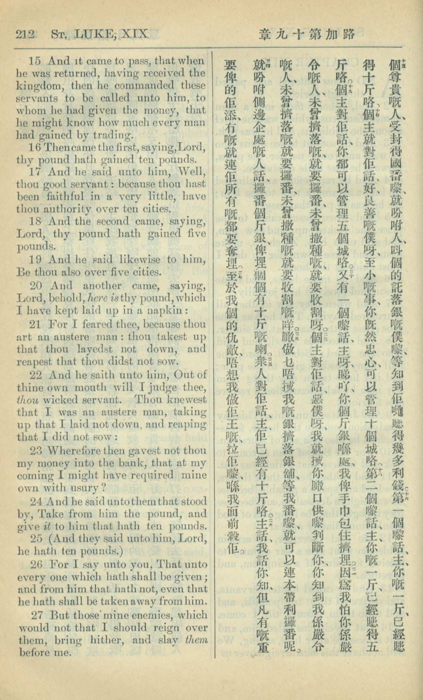 1909年中西字新約全書 路加福音 19 章 15 節到 19 章 27 節