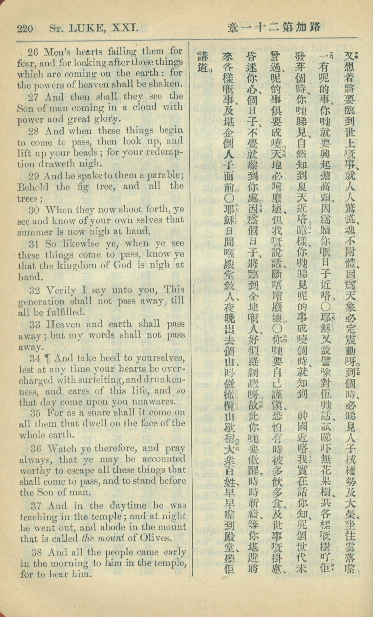 1909年中西字新約全書 路加福音 21 章 26 節到 21 章 38 節