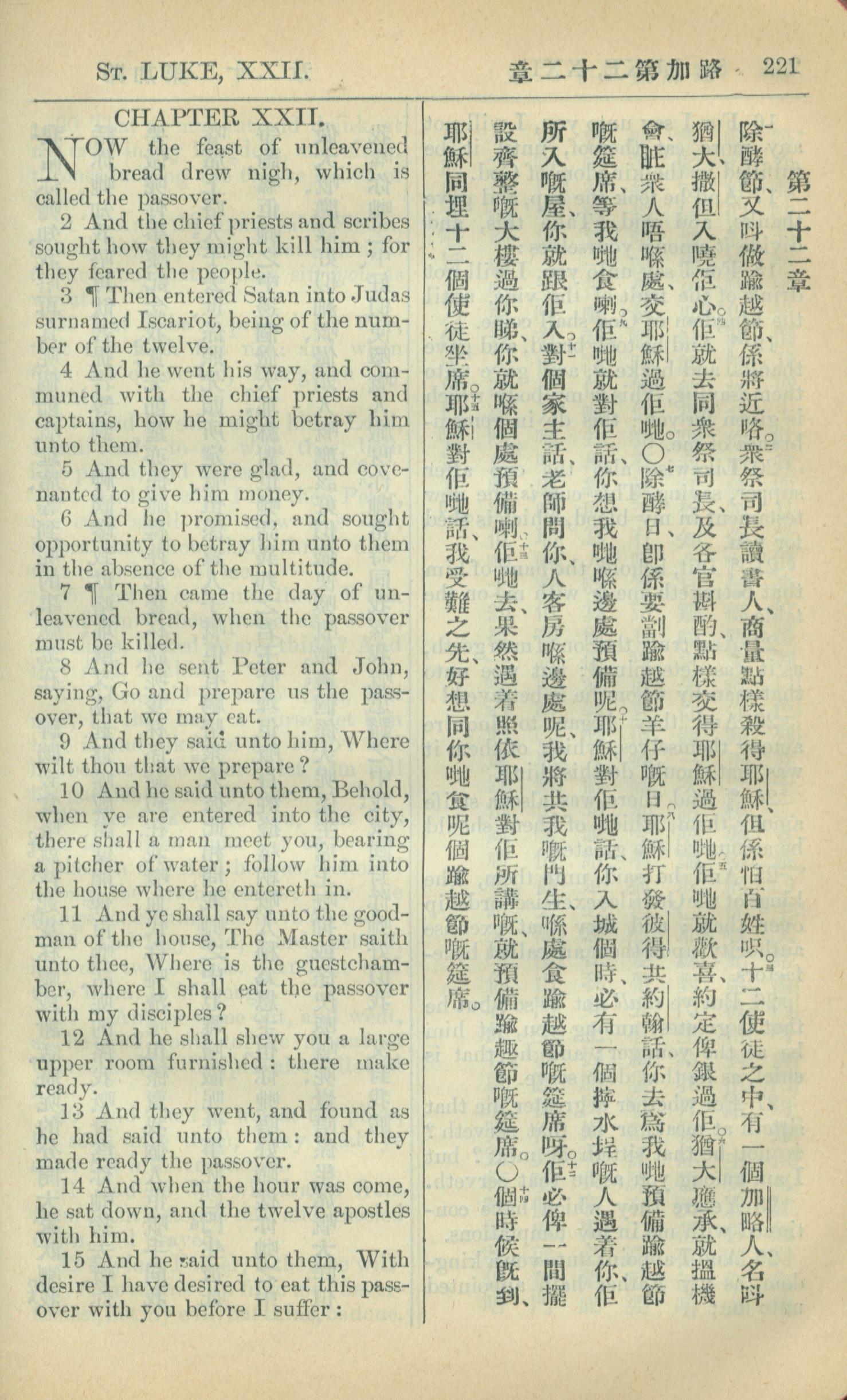 1909年中西字新約全書 路加福音 22 章 1 節到 22 章 15 節