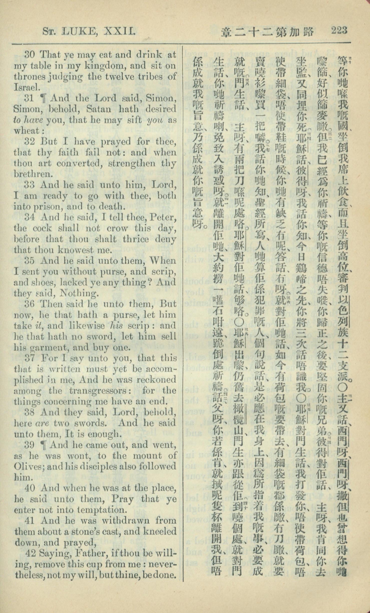 1909年中西字新約全書 路加福音 22 章 30 節到 22 章 42 節