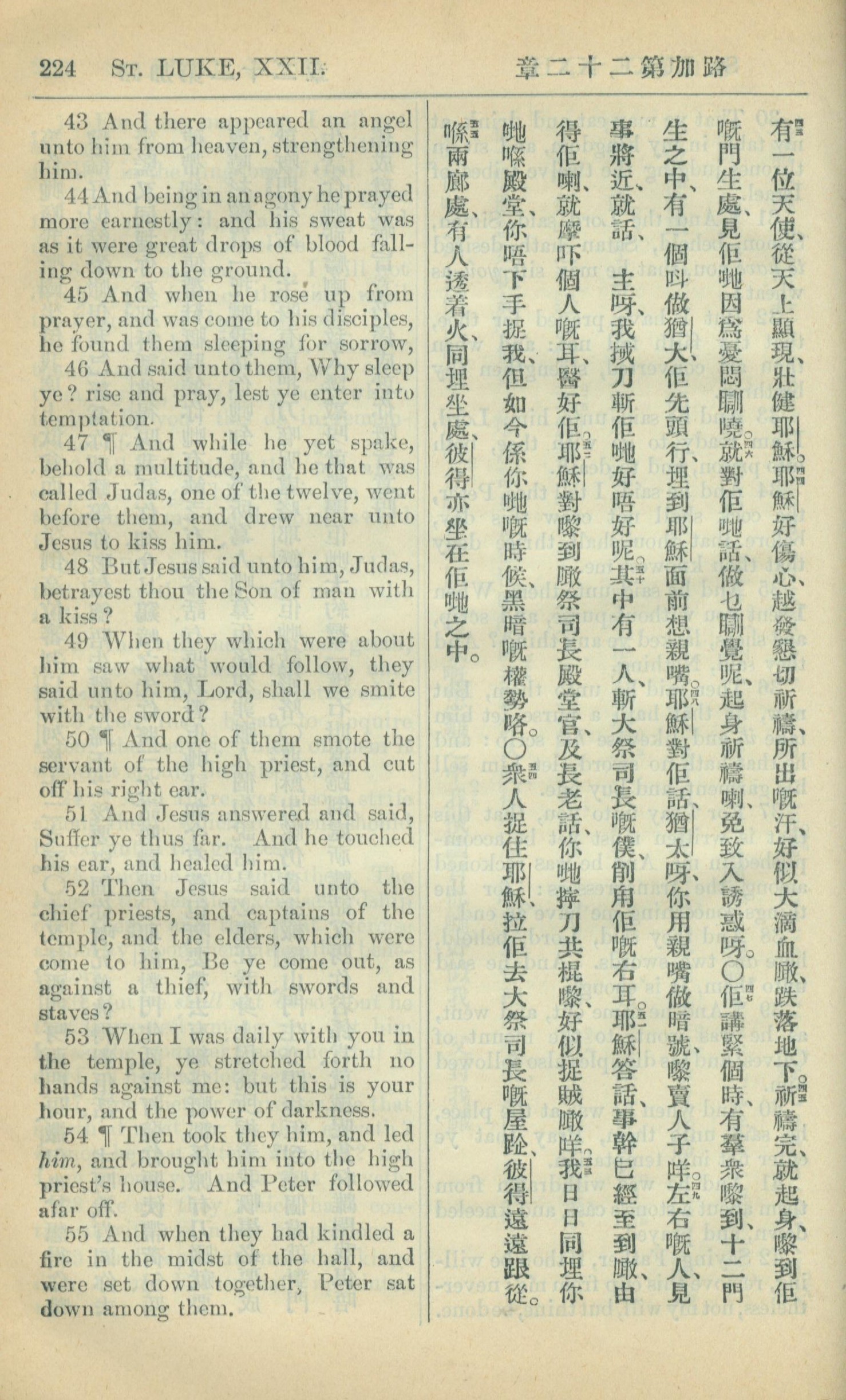 1909年中西字新約全書 路加福音 22 章 43 節到 22 章 55 節