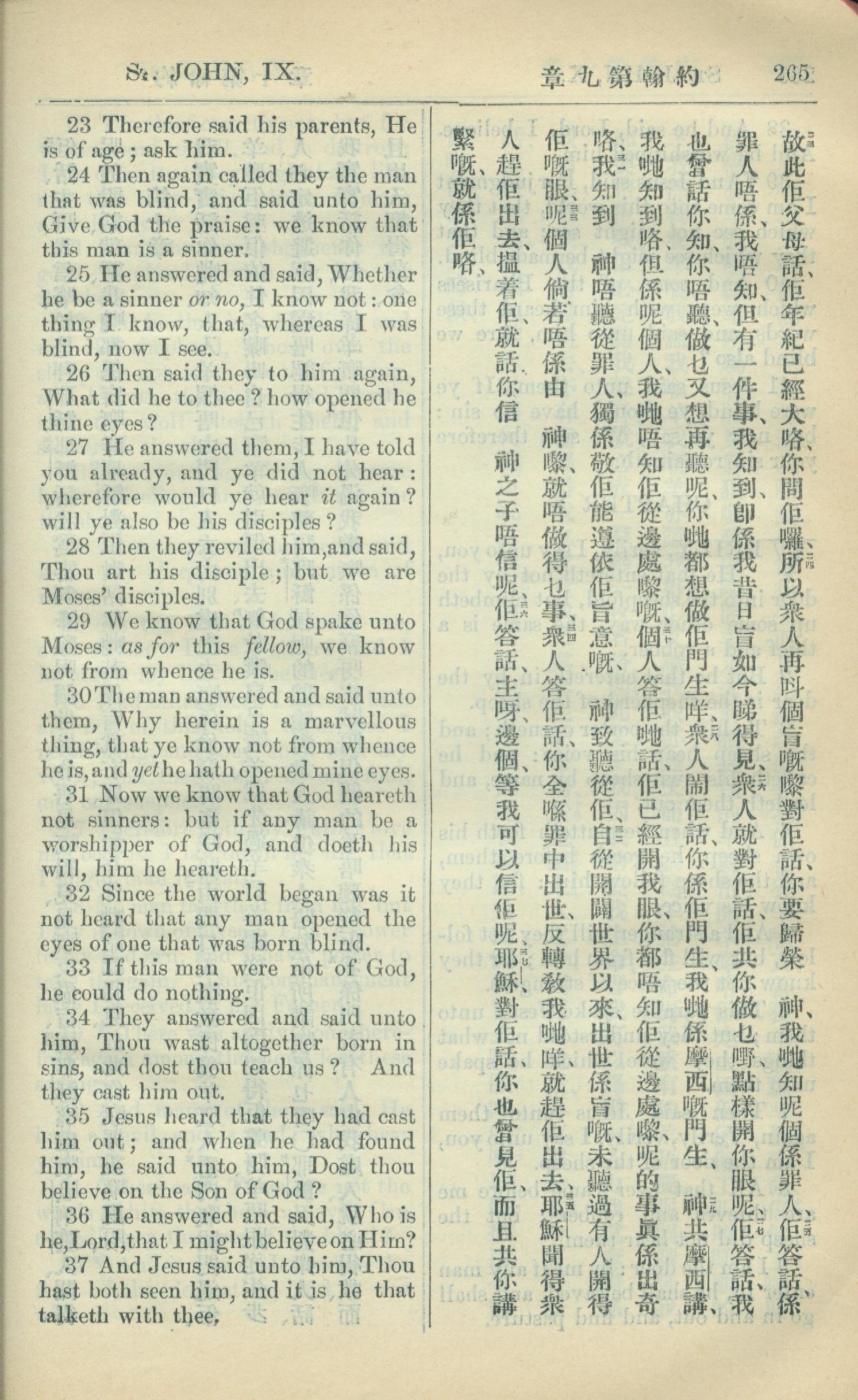 1909年中西字新約全書 約翰福音 9 章 23 節到 9 章 37 節