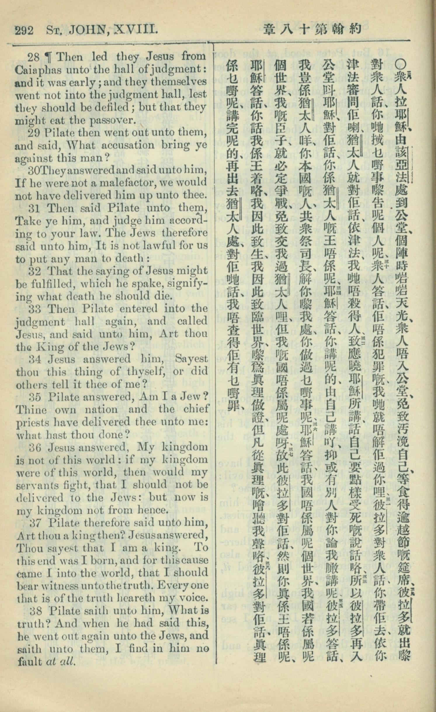 1909年中西字新約全書 約翰福音 18 章 28 節到 18 章 38 節