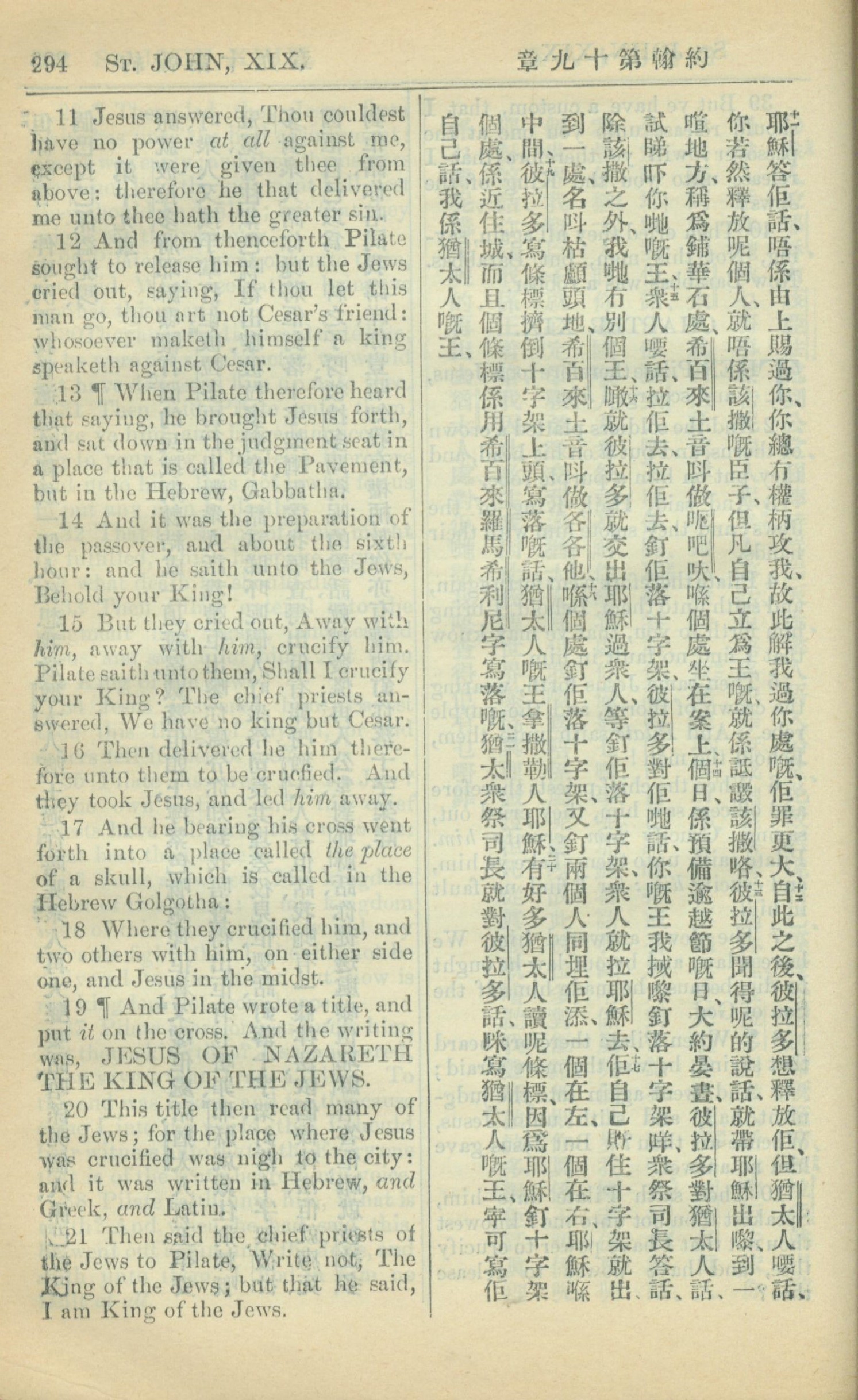 1909年中西字新約全書 約翰福音 19 章 11 節到 19 章 21 節