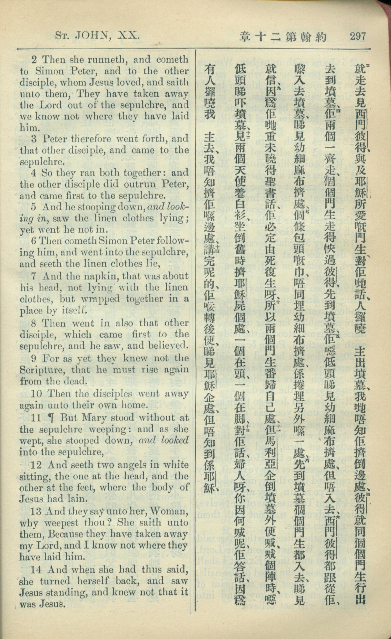 1909年中西字新約全書 約翰福音 20 章 2 節到 20 章 14 節