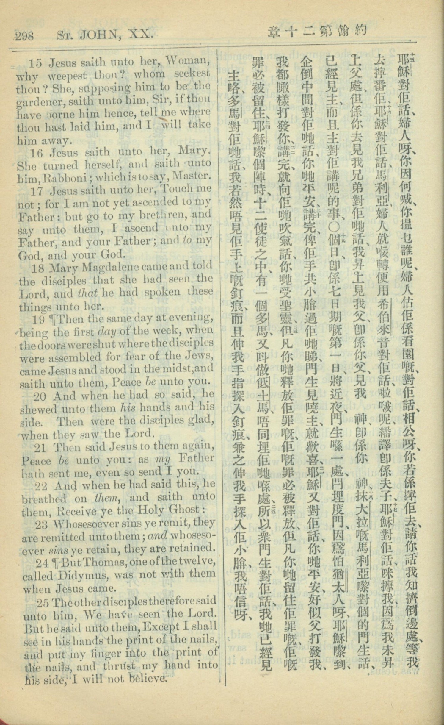 1909年中西字新約全書 約翰福音 20 章 15 節到 20 章 25 節