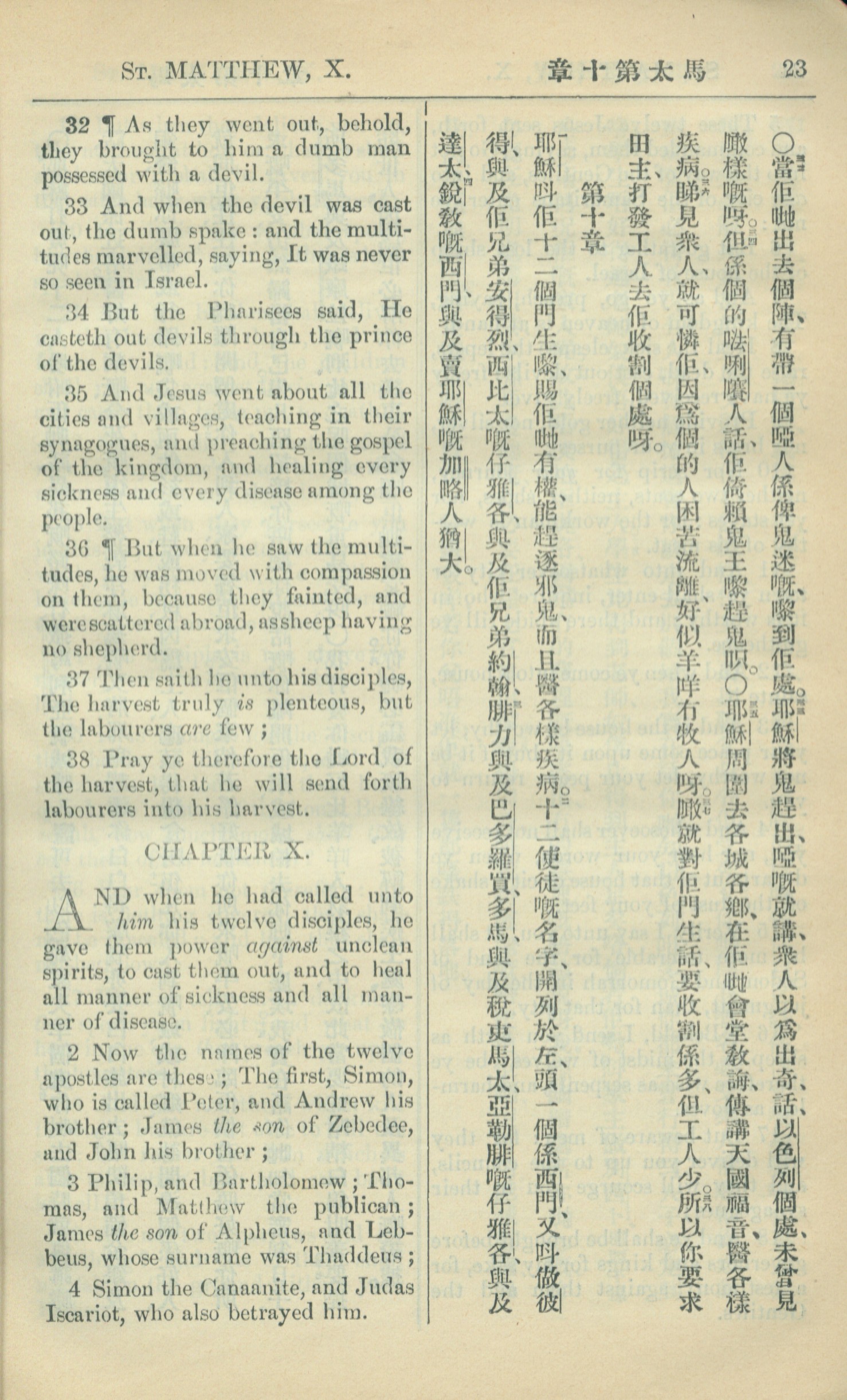 1909年中西字新約全書 馬太福音 9 章 32 節到 10 章 4 節