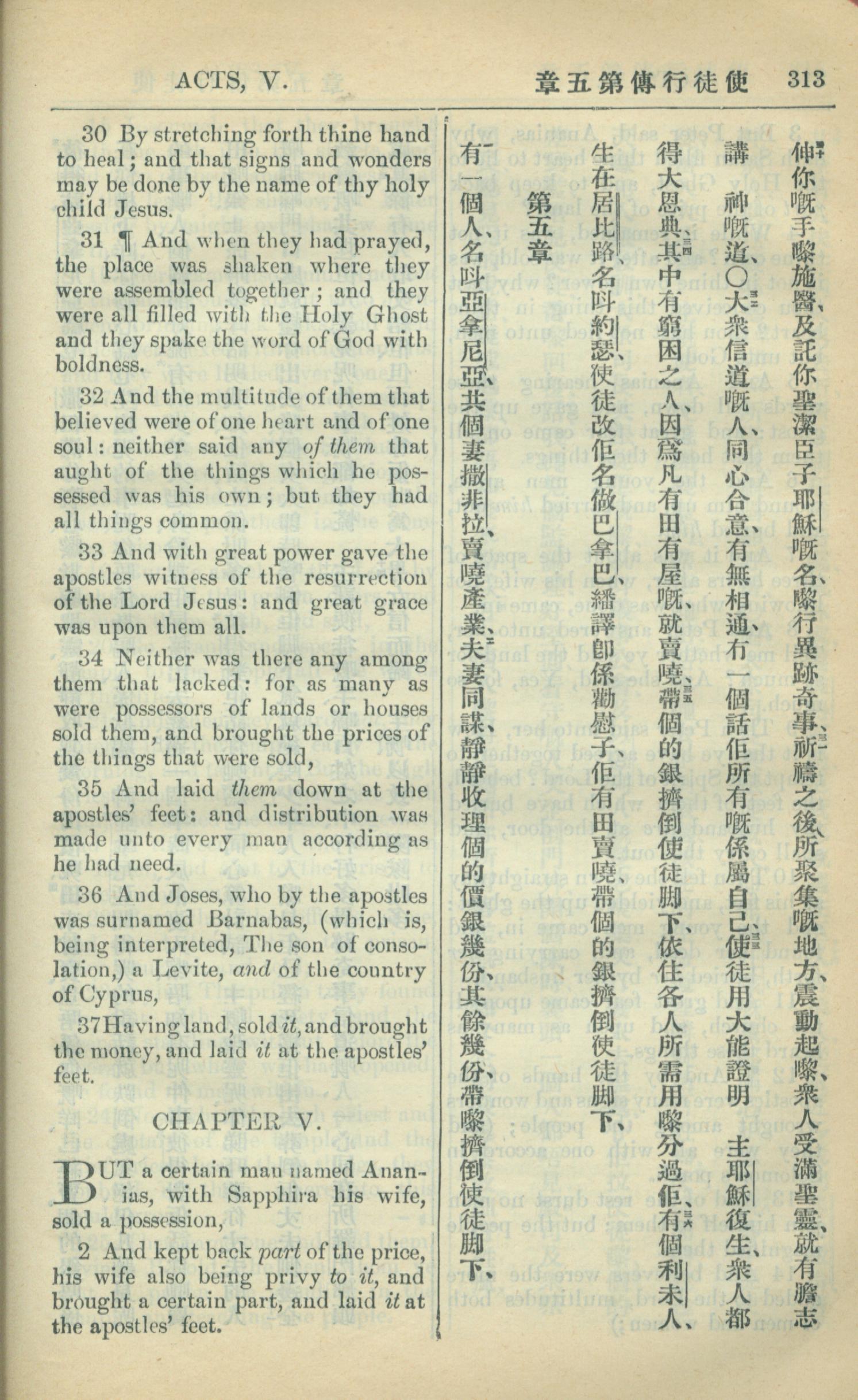 1909年中西字新約全書 使徒行傳 4 章 30 節到 5 章 2 節