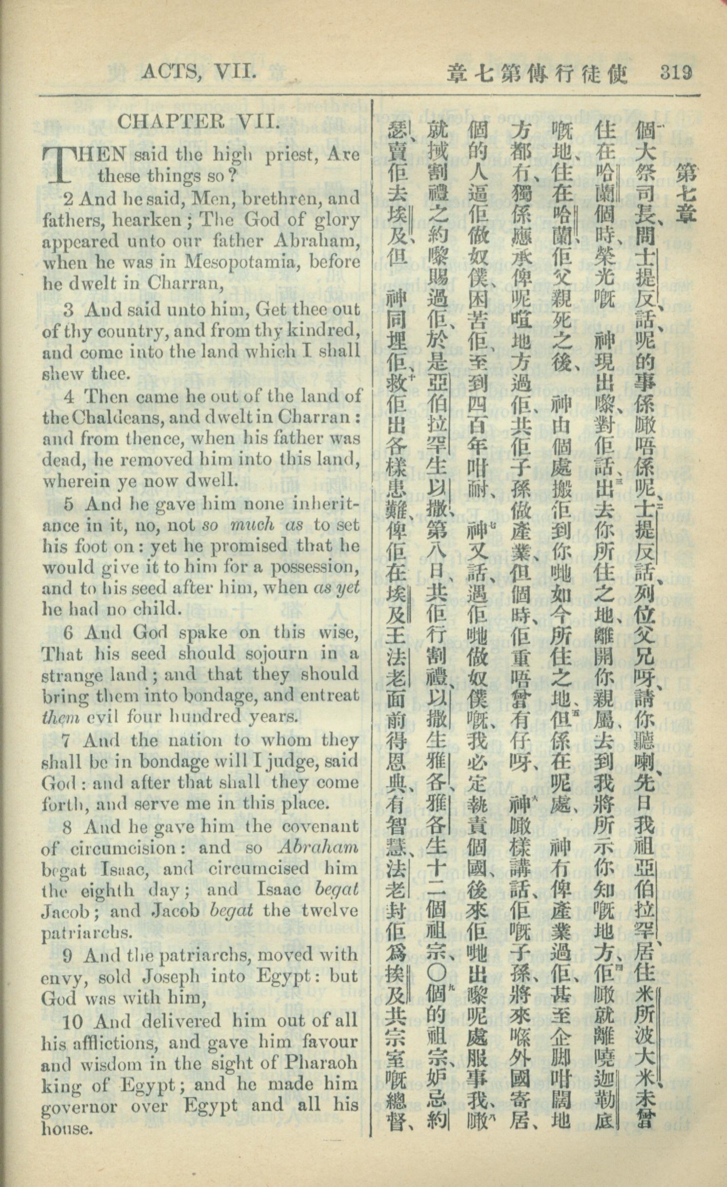 1909年中西字新約全書 使徒行傳 7 章 1 節到 7 章 10 節