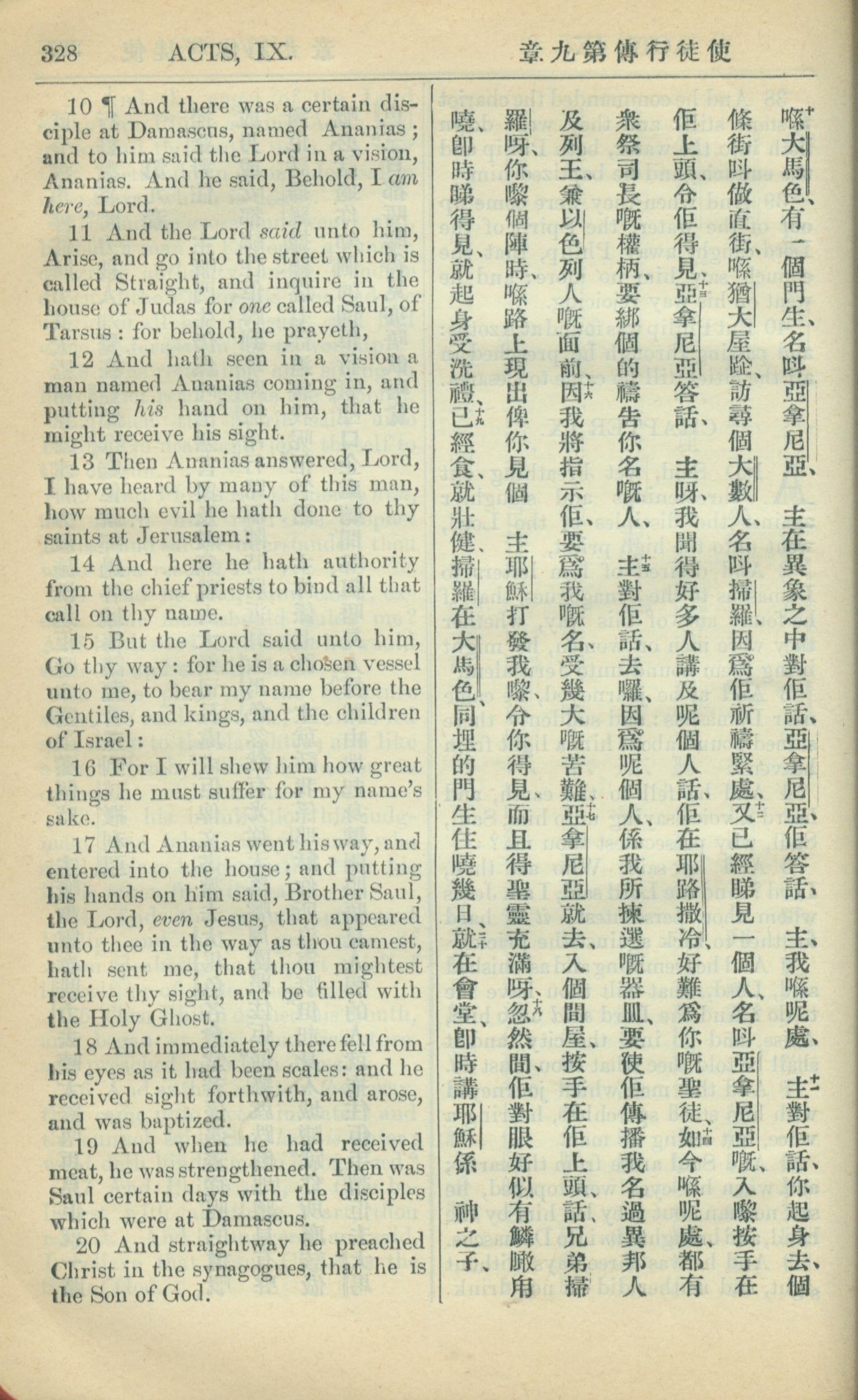 1909年中西字新約全書 使徒行傳 9 章 10 節到 9 章 20 節