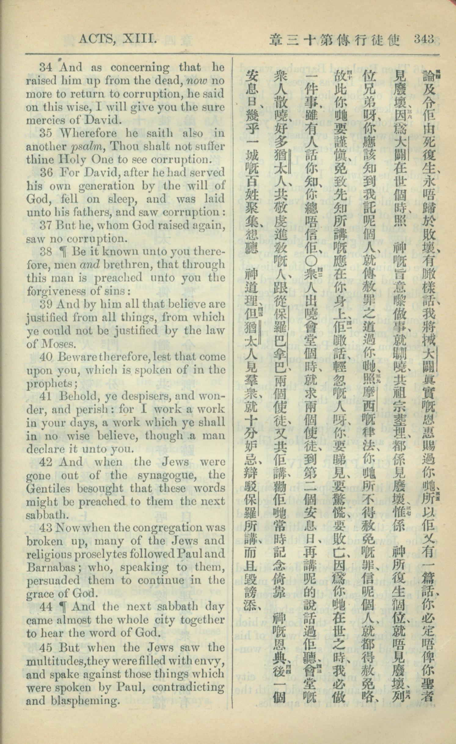 1909年中西字新約全書 使徒行傳 13 章 34 節到 13 章 45 節