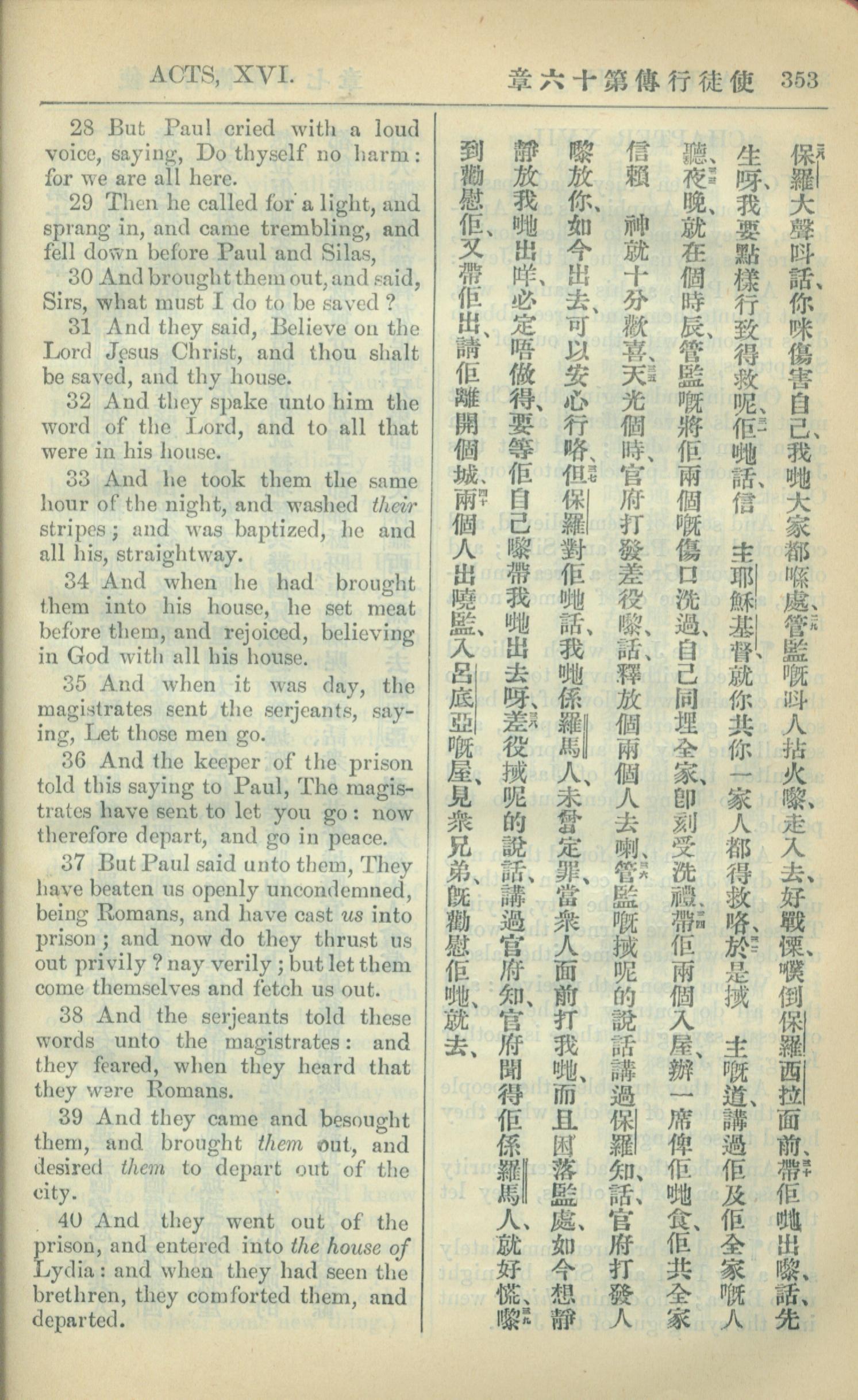 1909年中西字新約全書 使徒行傳 16 章 28 節到 16 章 40 節