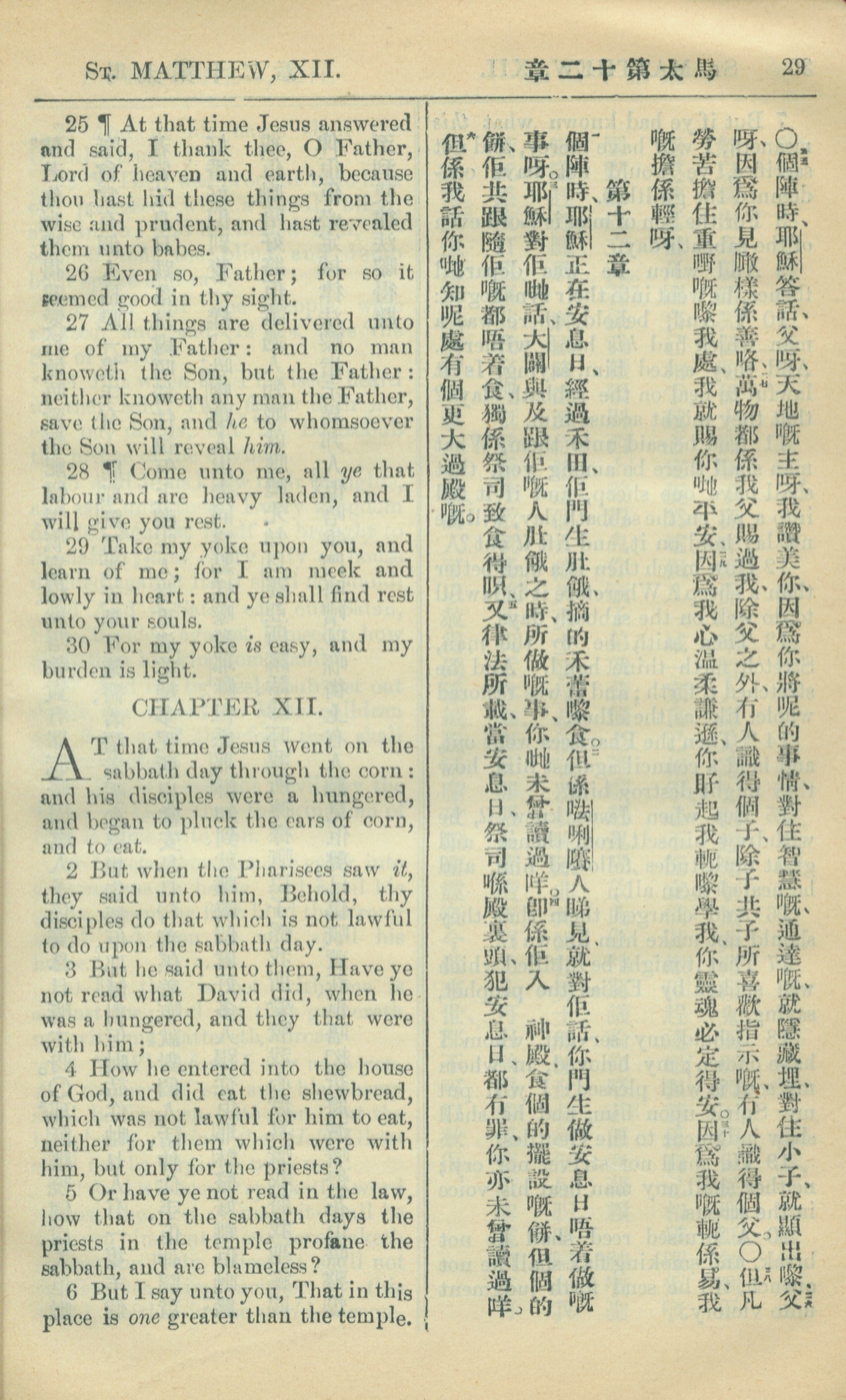 1909年中西字新約全書 馬太福音 11 章 25 節到 12 章 6 節