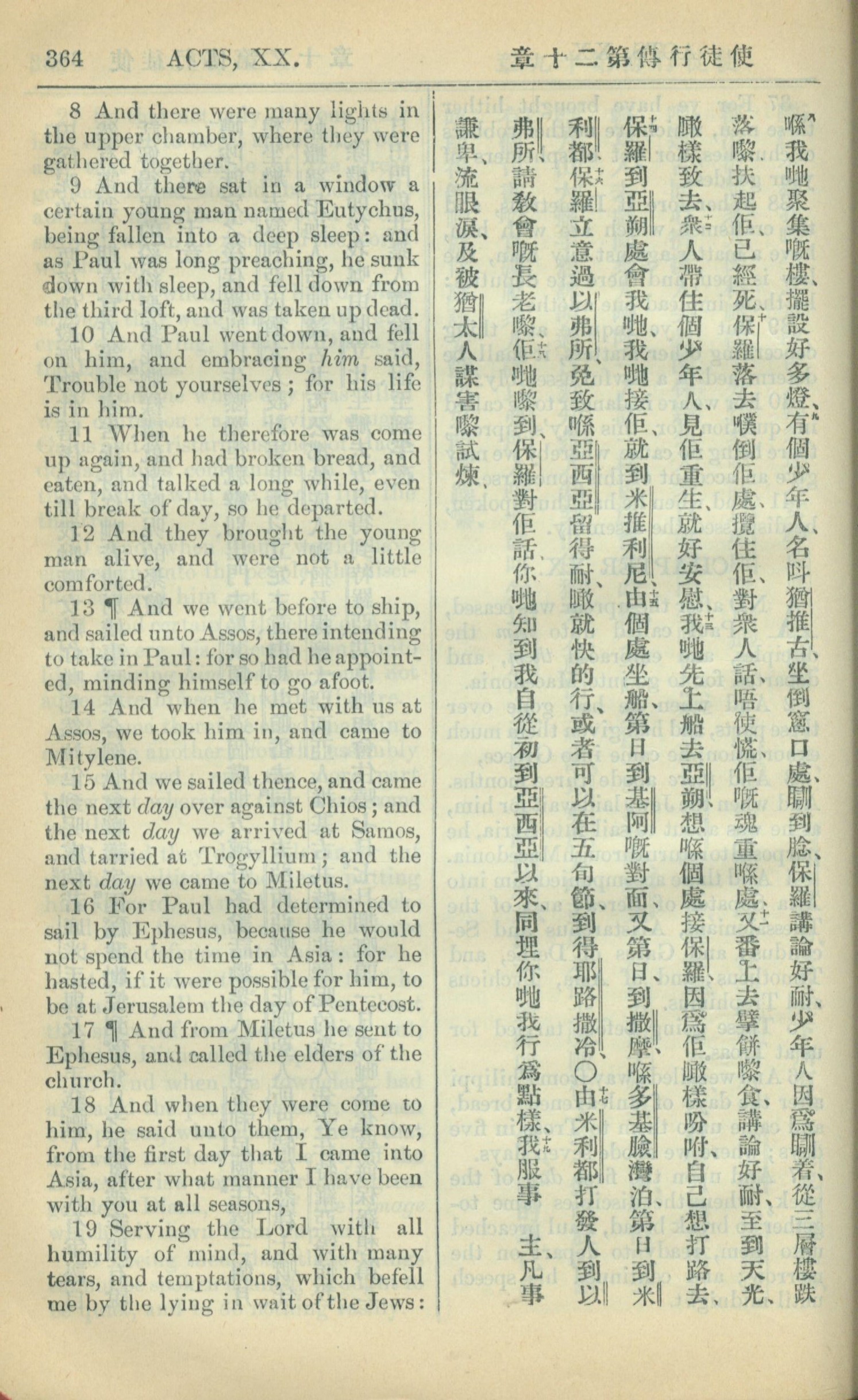 1909年中西字新約全書 使徒行傳 20 章 8 節到 20 章 19 節