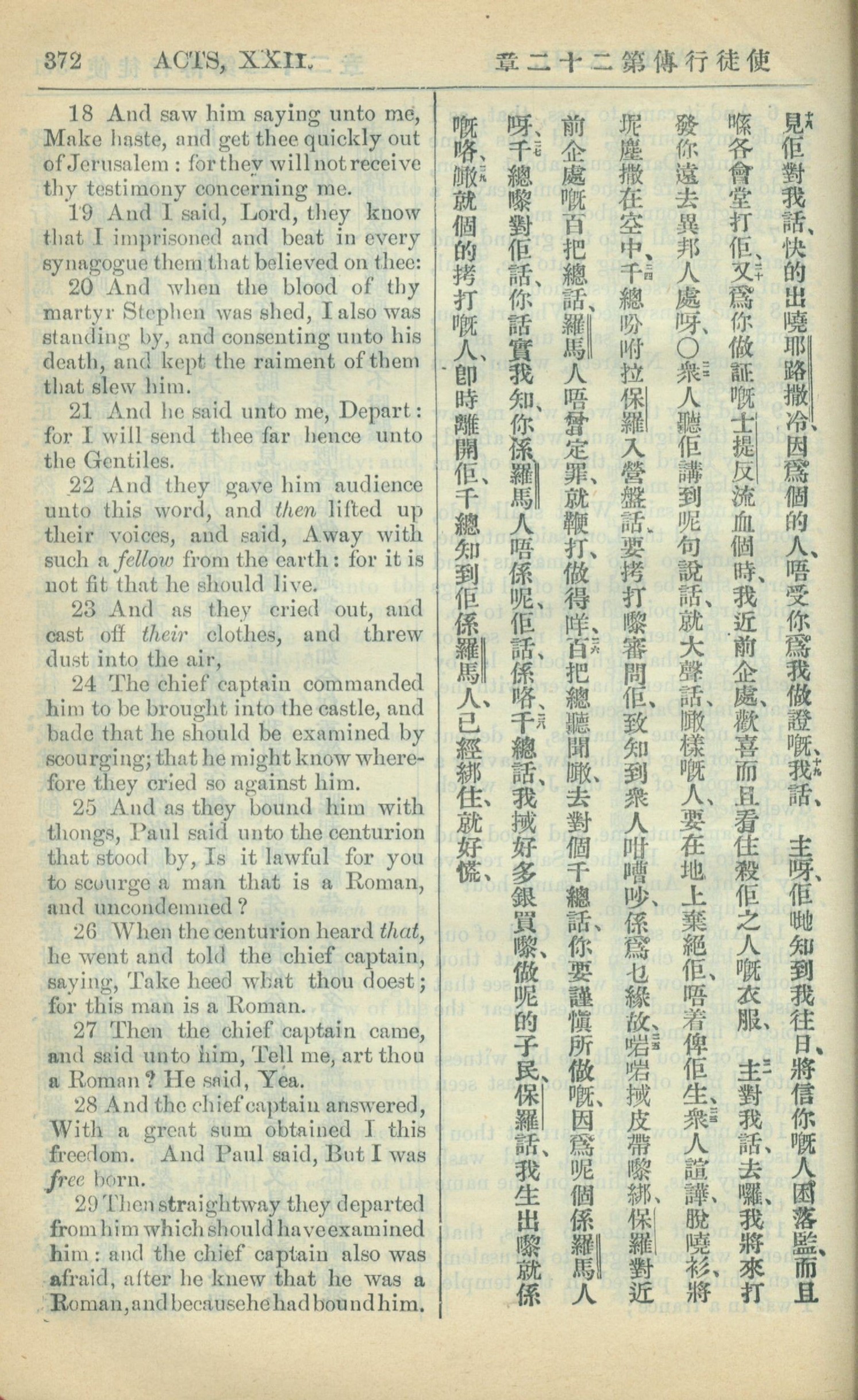 1909年中西字新約全書 使徒行傳 22 章 18 節到 22 章 29 節