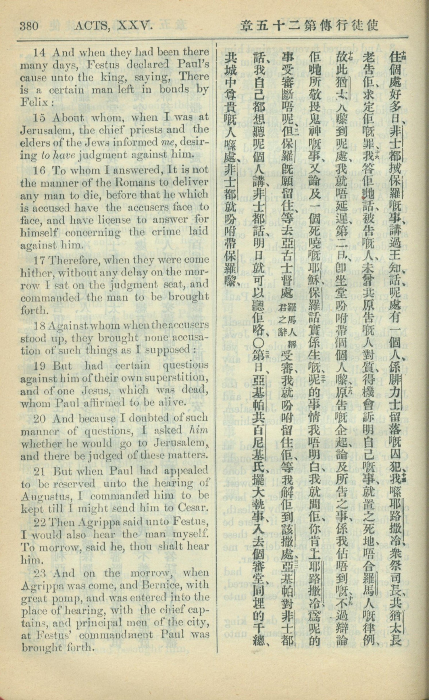 1909年中西字新約全書 使徒行傳 25 章 14 節到 25 章 23 節