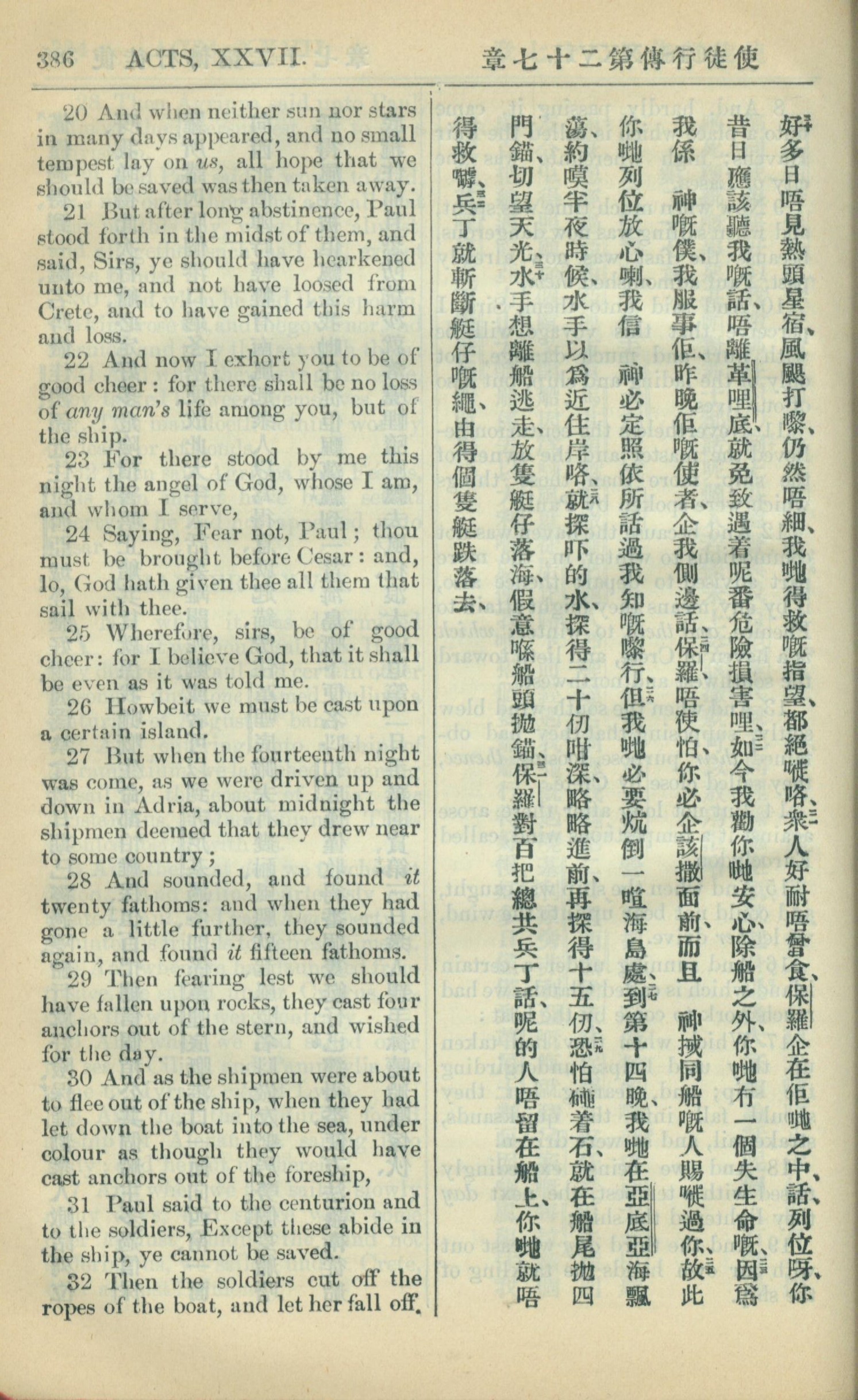 1909年中西字新約全書 使徒行傳 27 章 20 節到 27 章 32 節