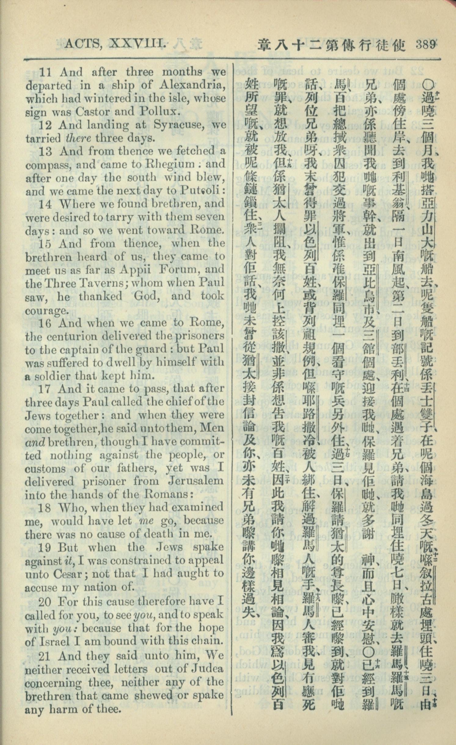 1909年中西字新約全書 使徒行傳 28 章 11 節到 28 章 21 節