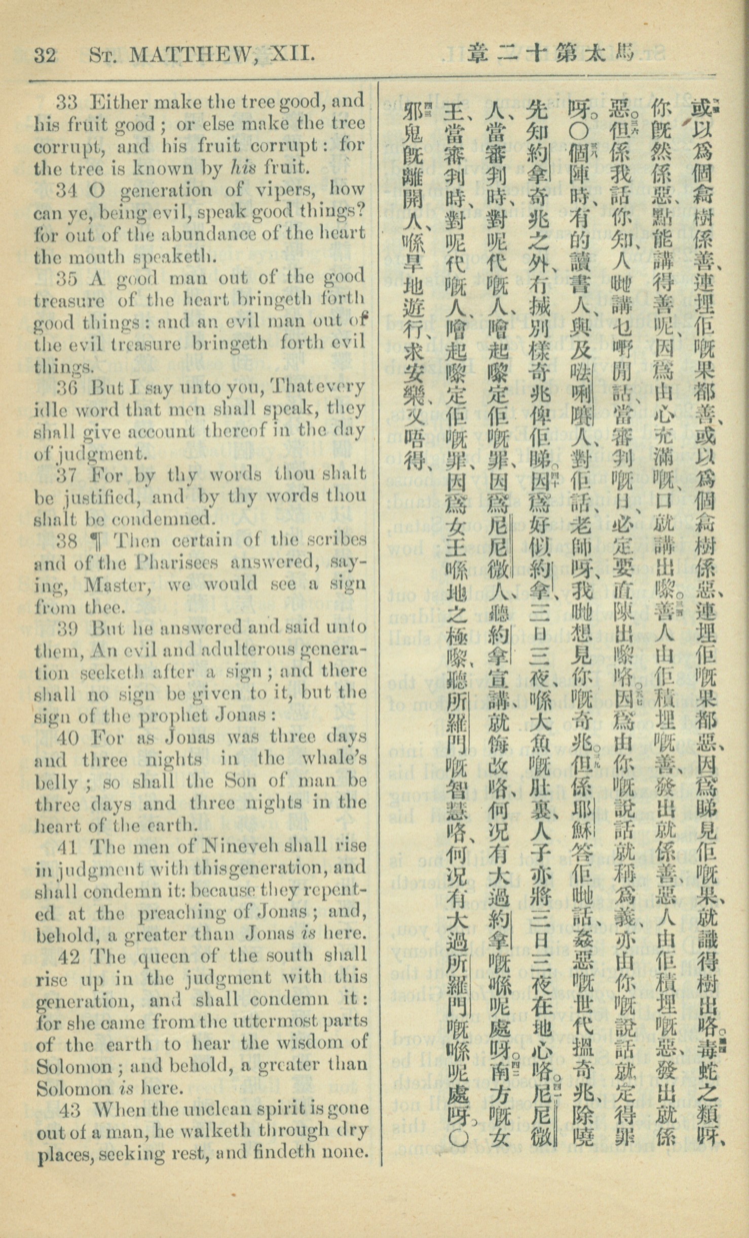 1909年中西字新約全書 馬太福音 12 章 33 節到 12 章 43 節