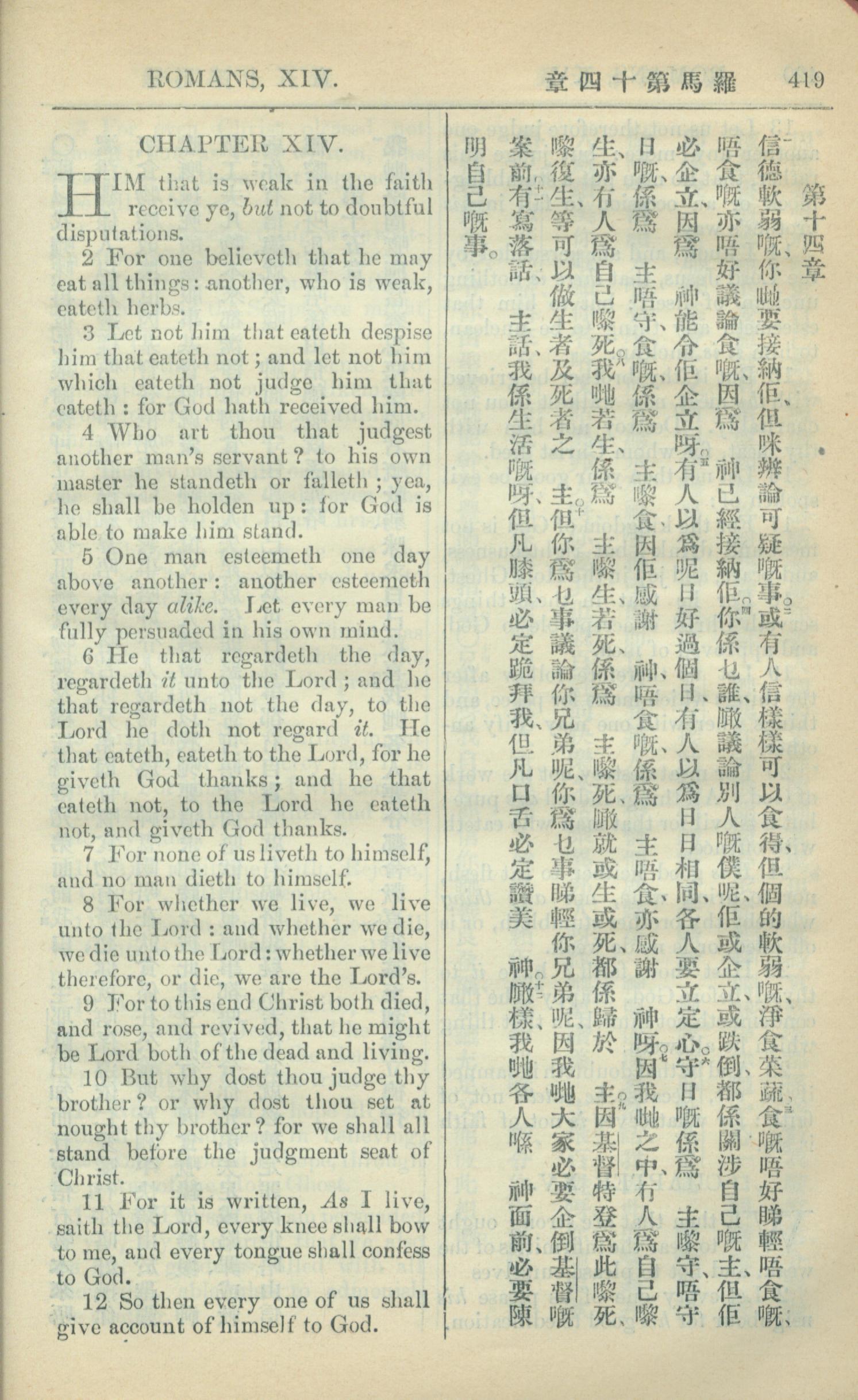 1909年中西字新約全書 羅馬書 14 章 1 節到 14 章 12 節