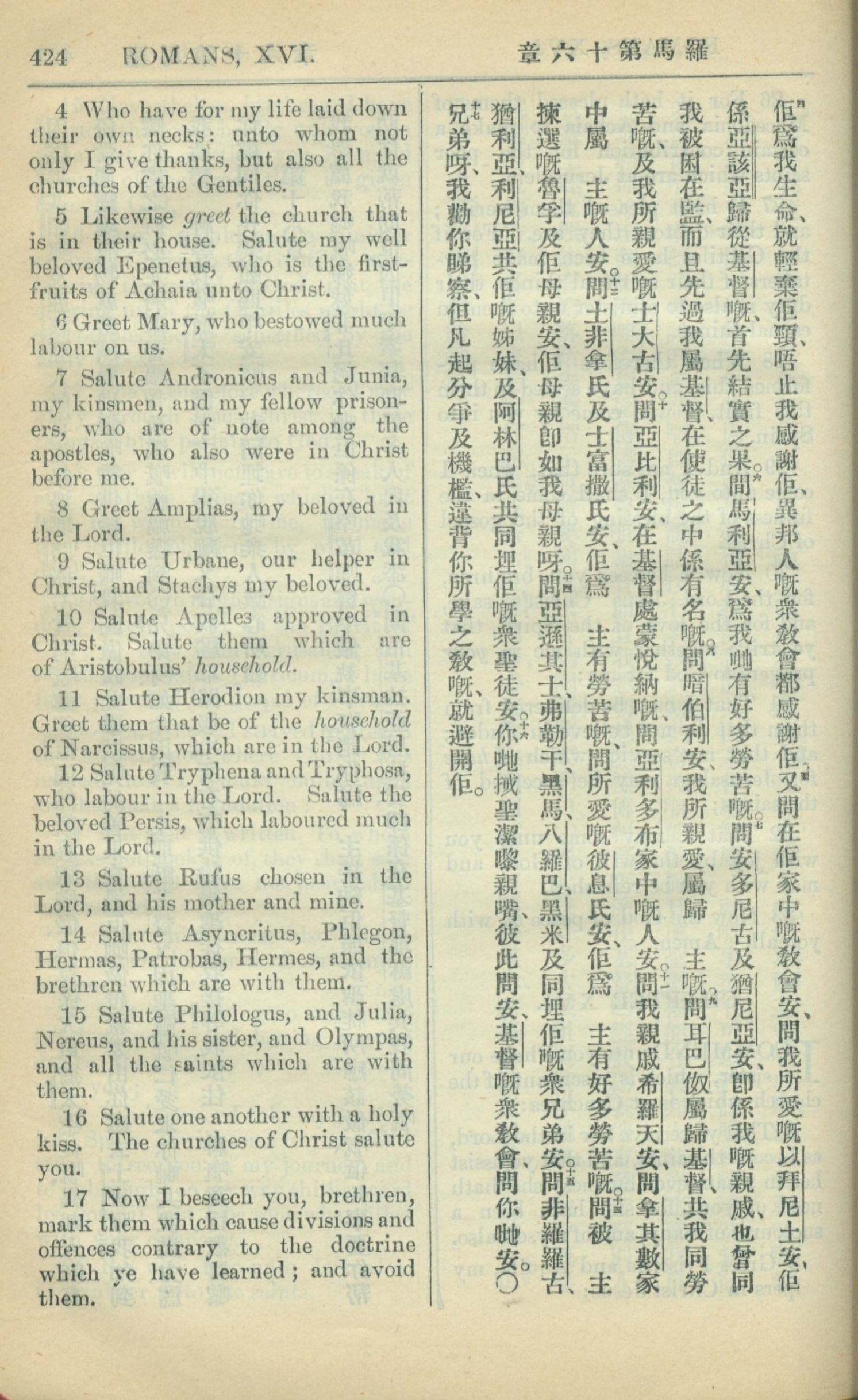 1909年中西字新約全書 羅馬書 16 章 4 節到 16 章 17 節