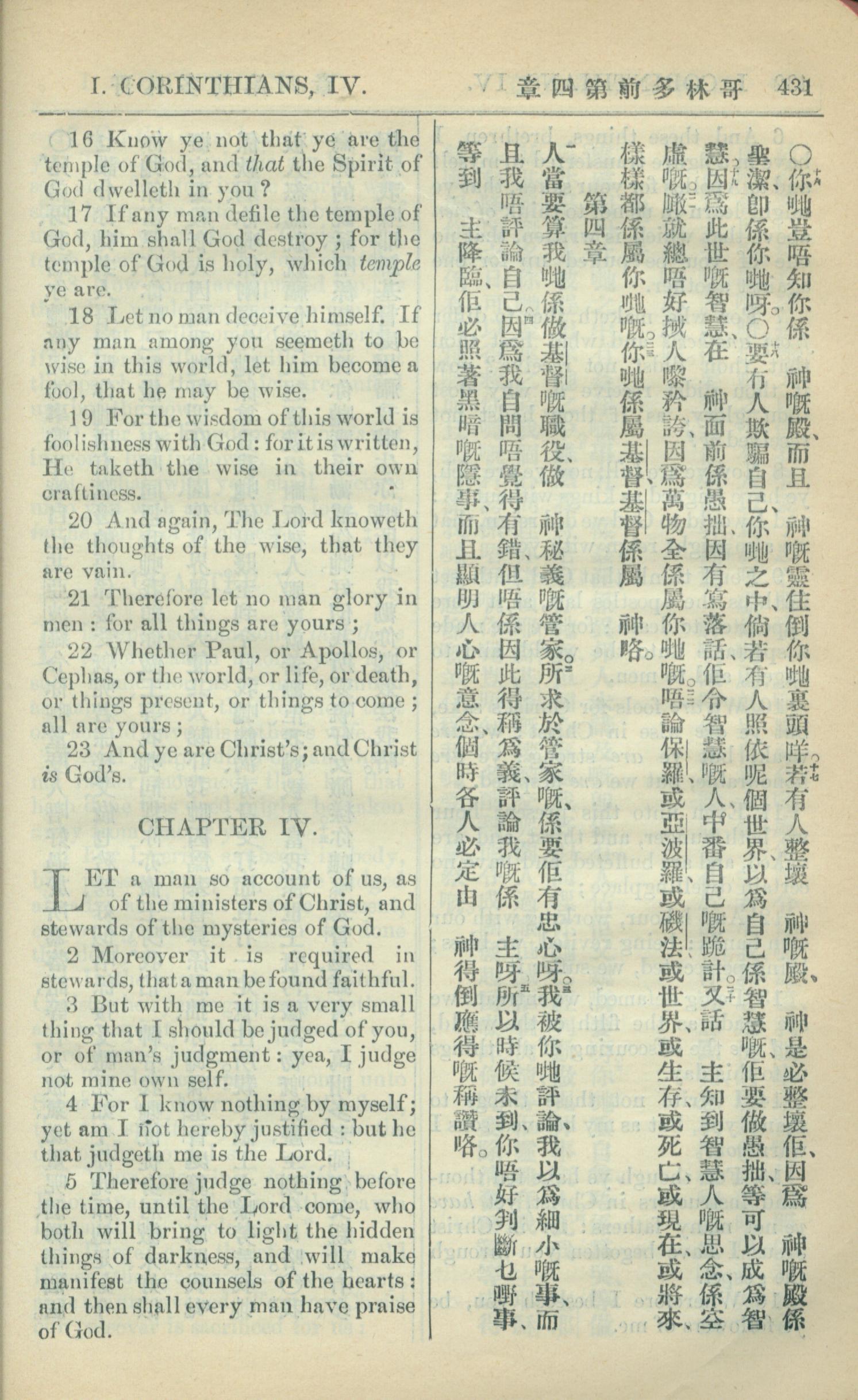 1909年中西字新約全書 哥林多前書 3 章 16 節到 4 章 5 節