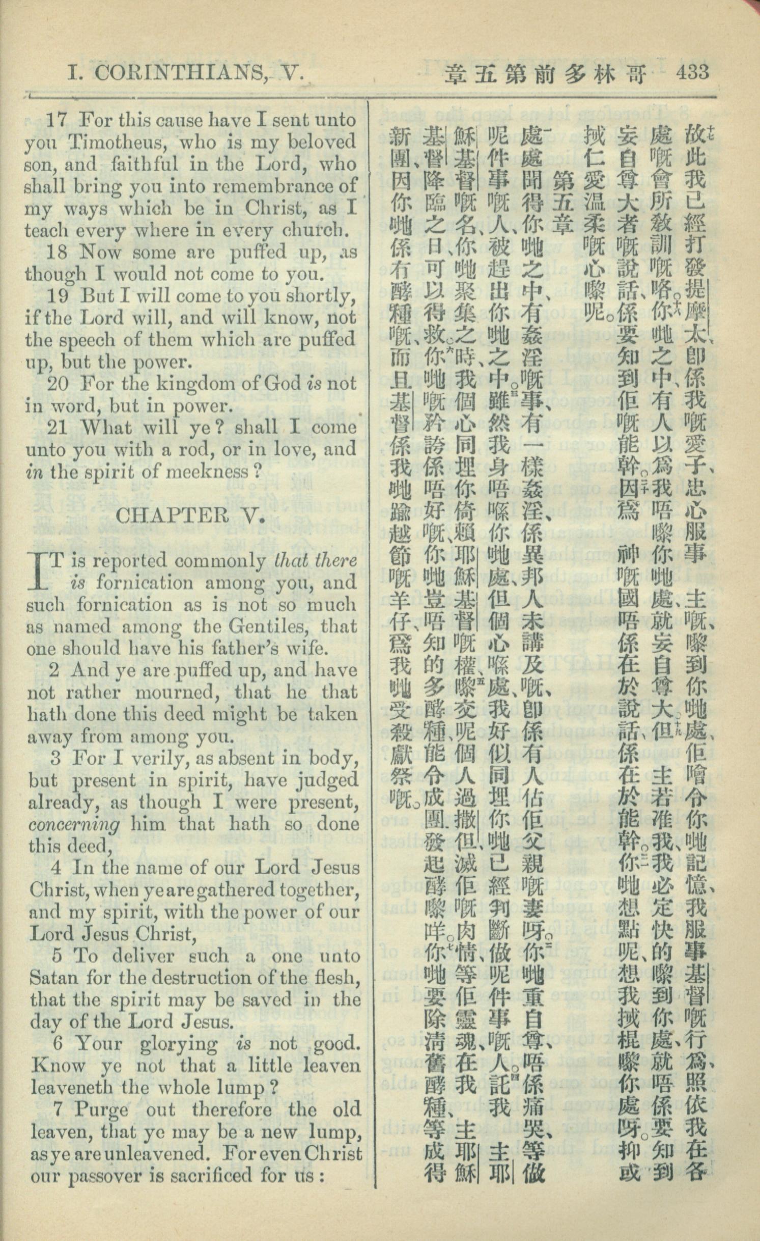 1909年中西字新約全書 哥林多前書 4 章 17 節到 5 章 7 節