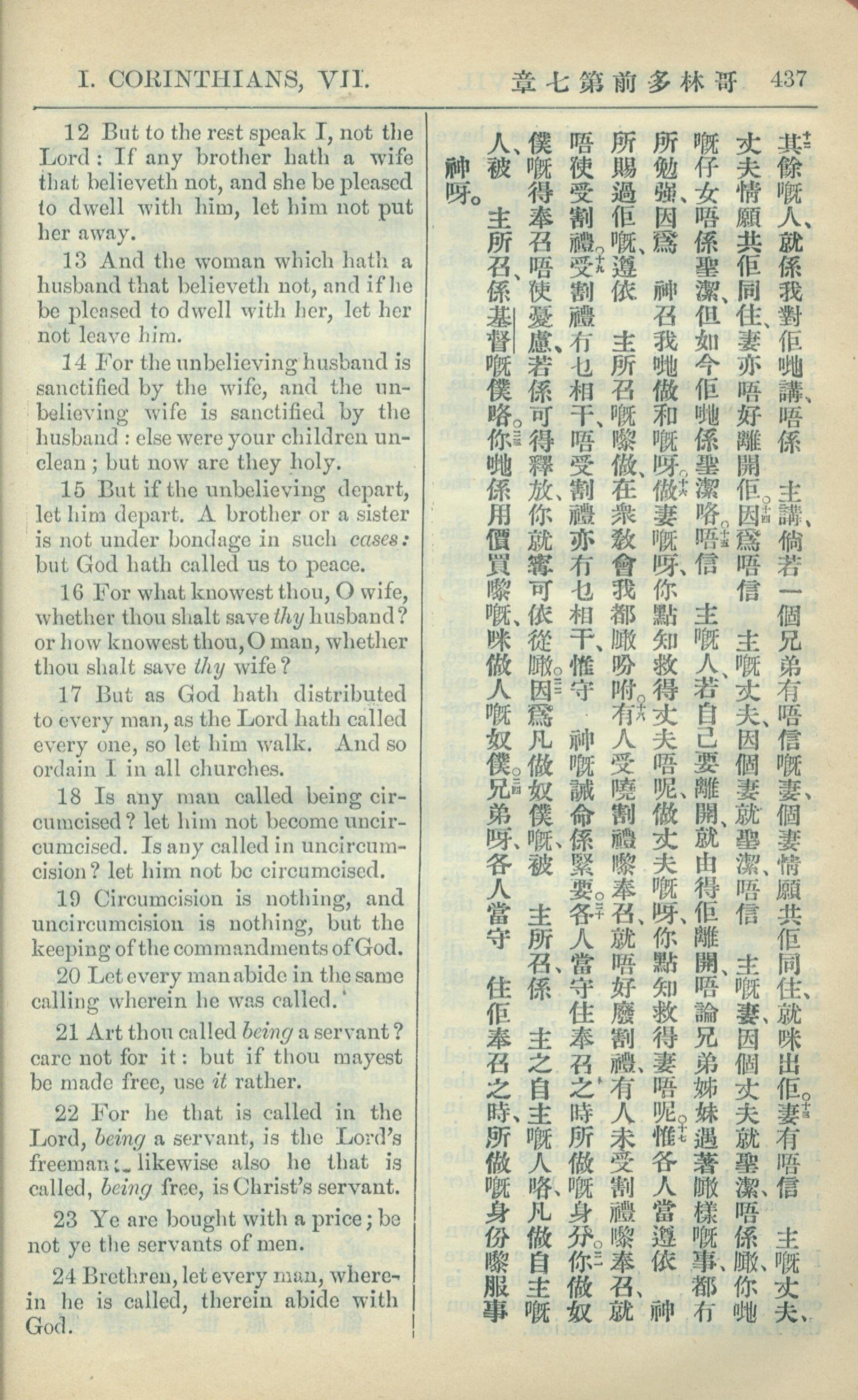 1909年中西字新約全書 哥林多前書 7 章 12 節到 7 章 24 節