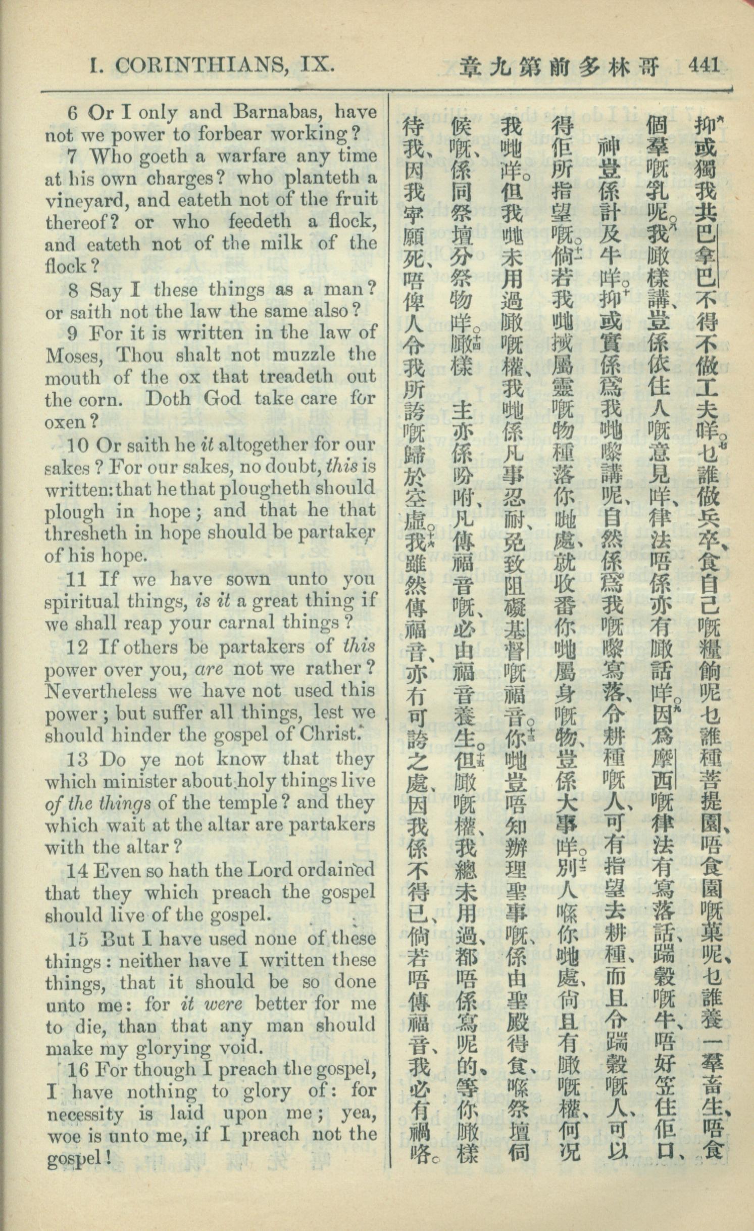 1909年中西字新約全書 哥林多前書 9 章 6 節到 9 章 16 節