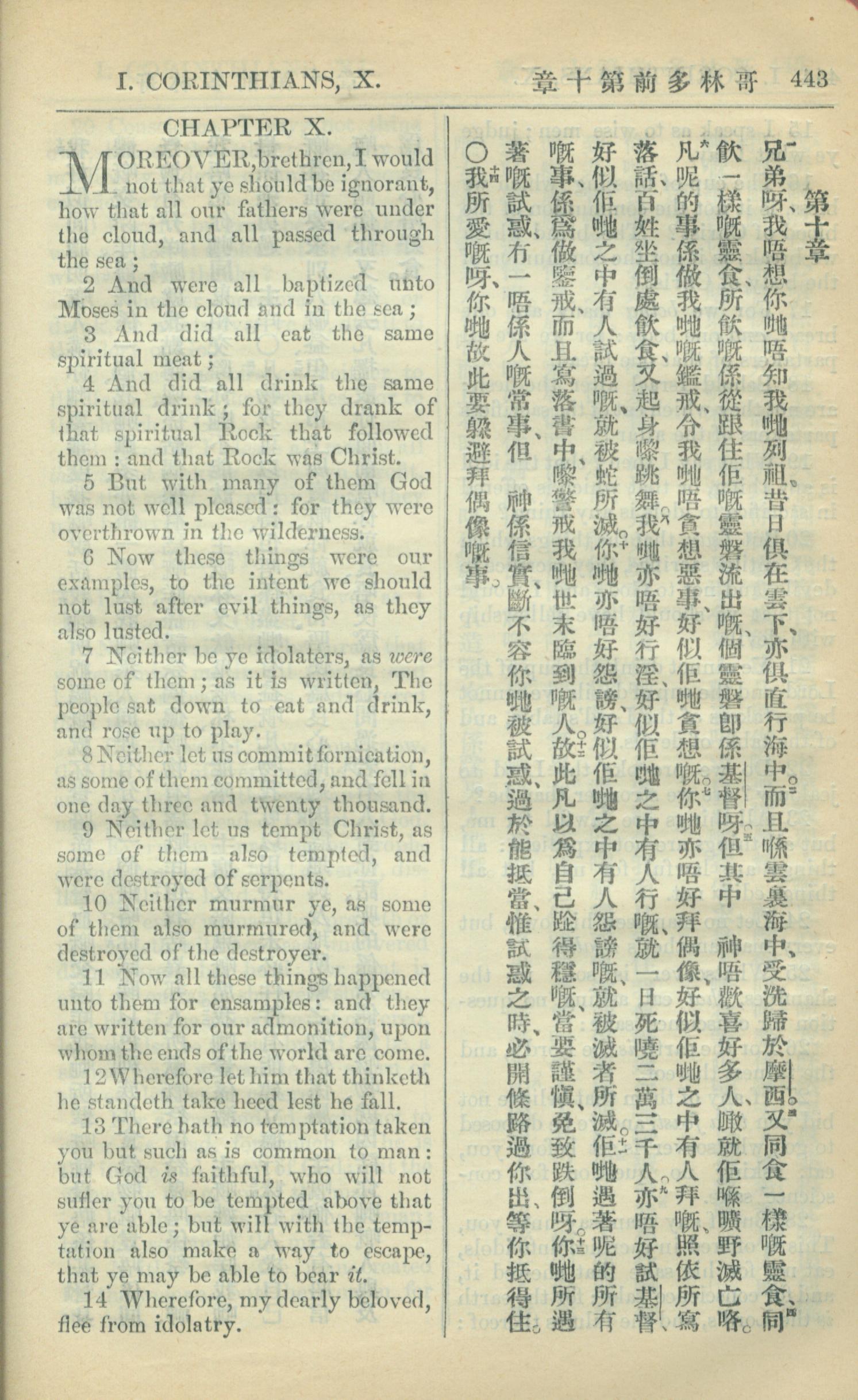 1909年中西字新約全書 哥林多前書 10 章 1 節到 10 章 14 節