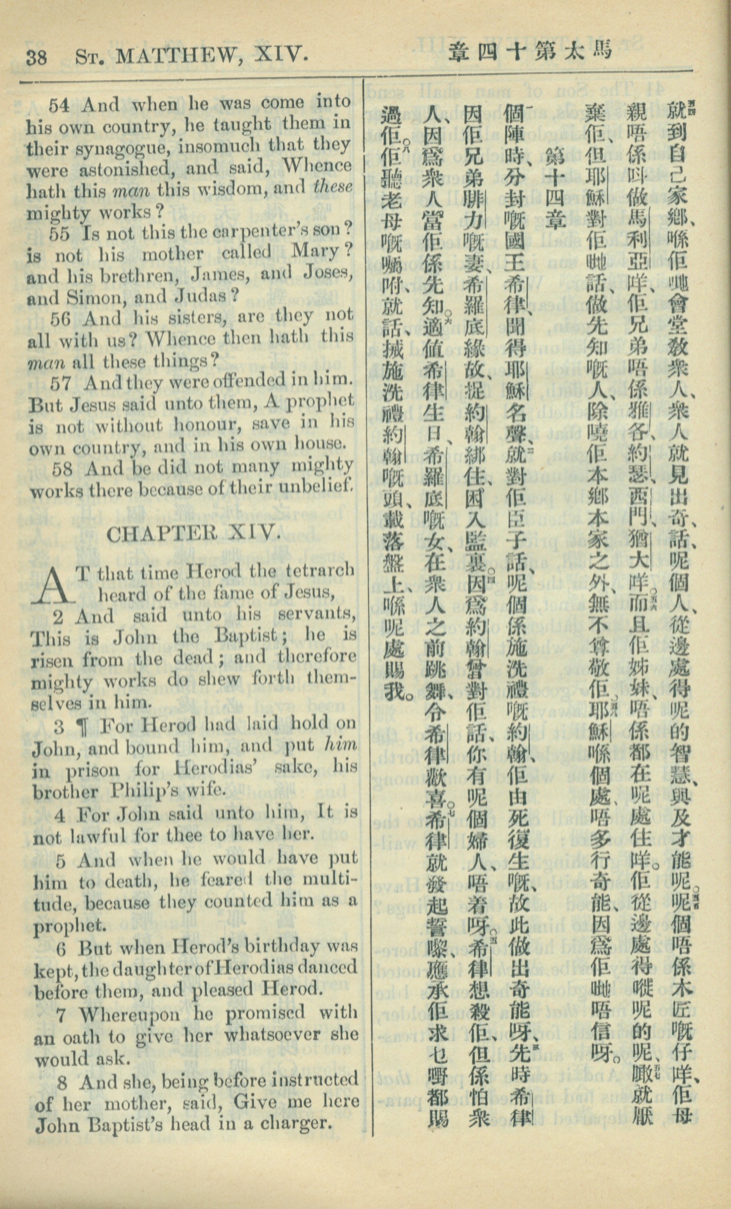 1909年中西字新約全書 馬太福音 13 章 54 節到 14 章 8 節