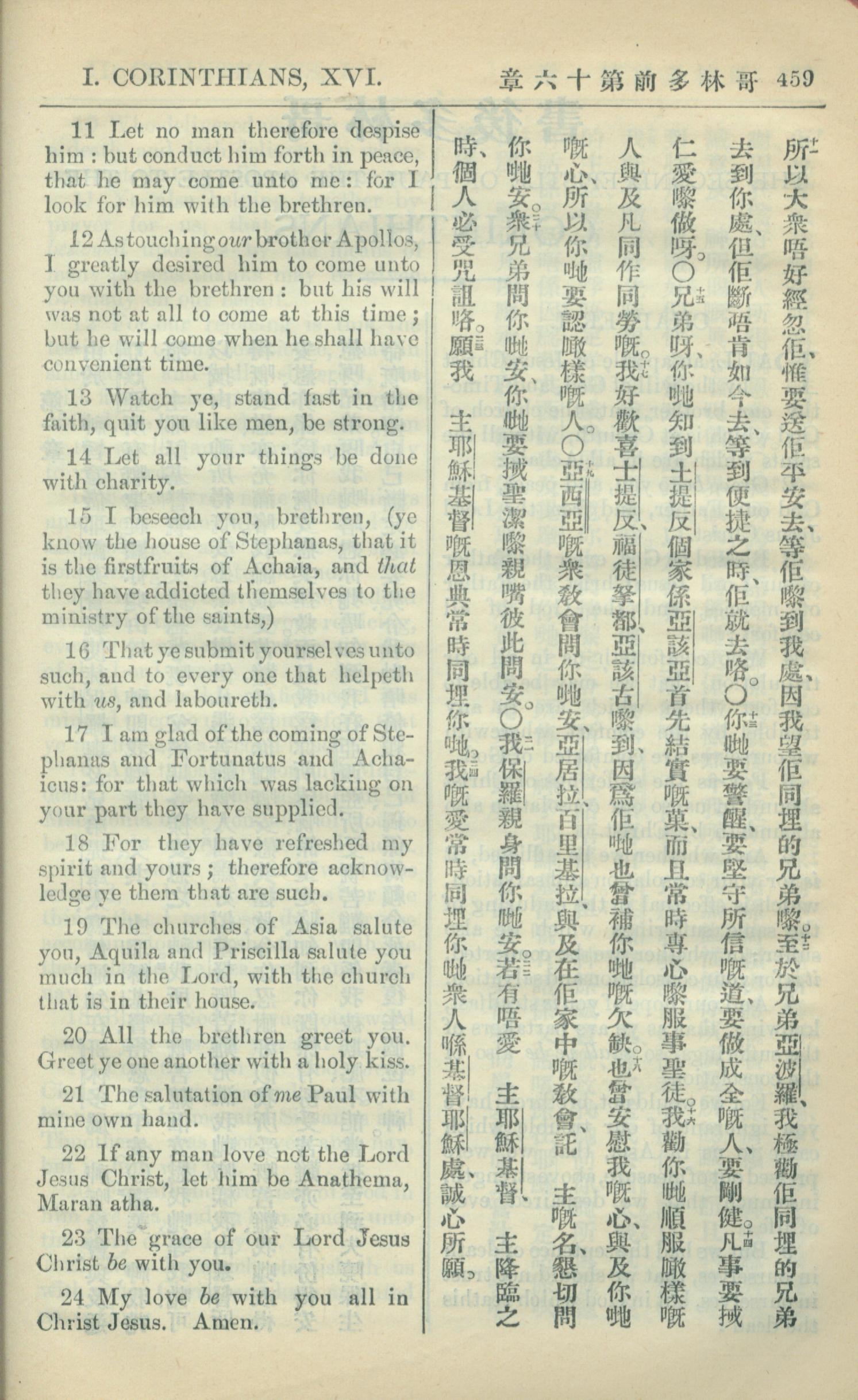1909年中西字新約全書 哥林多前書 16 章 11 節到 16 章 24 節