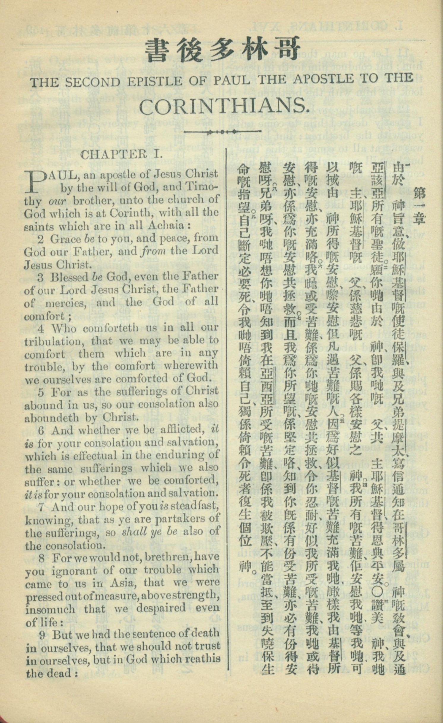 1909年中西字新約全書 哥林多後書 1 章 1 節到 1 章 9 節