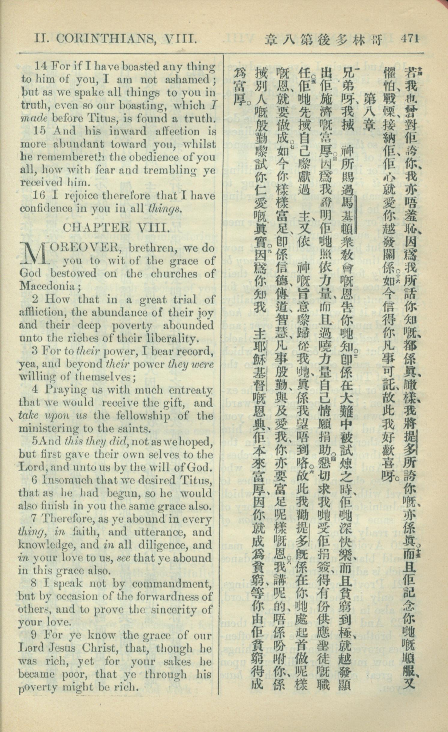1909年中西字新約全書 哥林多後書 7 章 14 節到 8 章 9 節