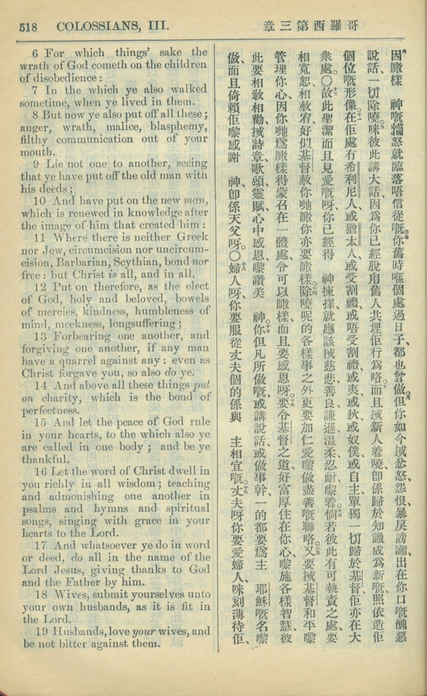 1909年中西字新約全書 歌羅西書 3 章 6 節到 3 章 19 節