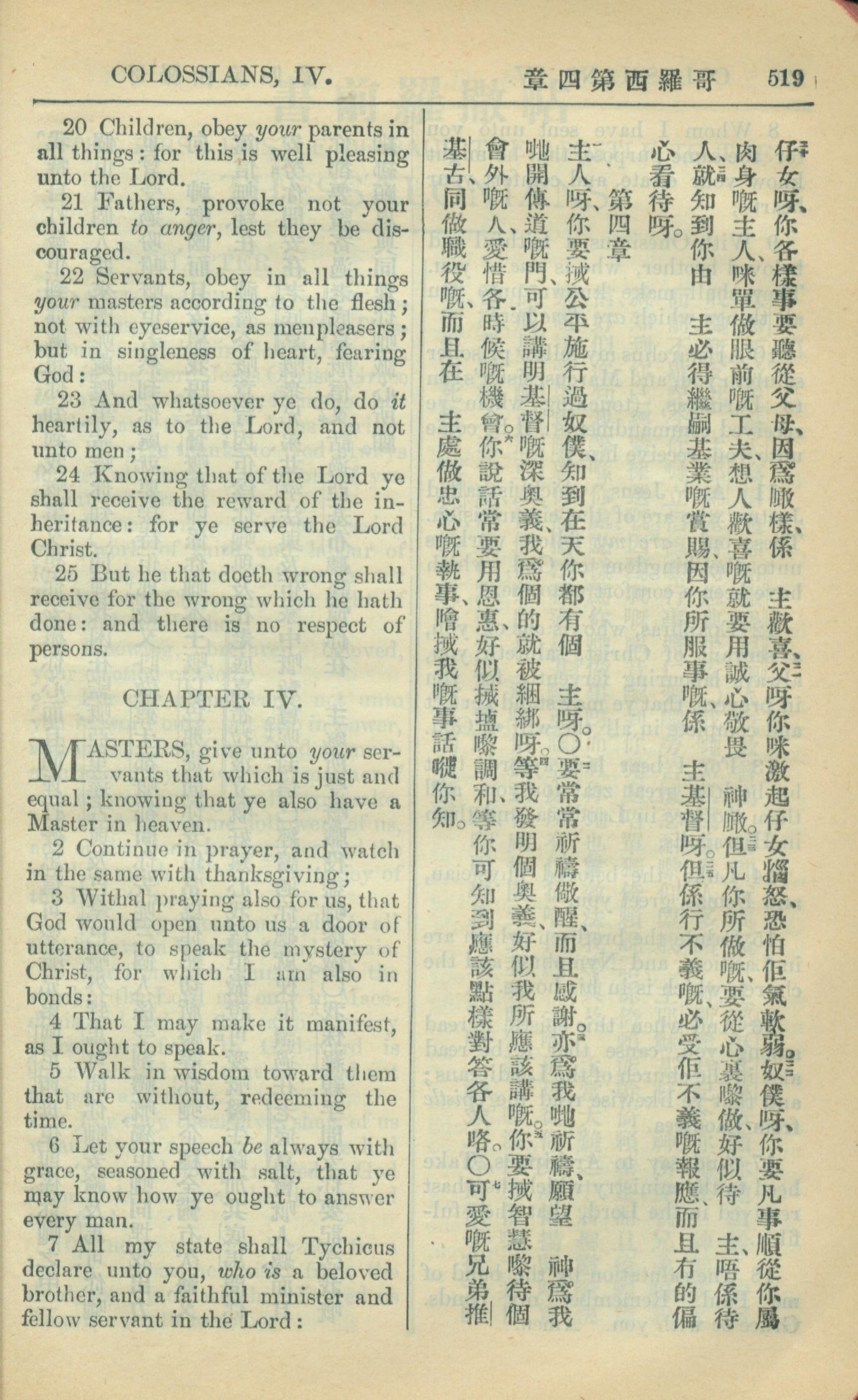1909年中西字新約全書 歌羅西書 3 章 20 節到 4 章 7 節