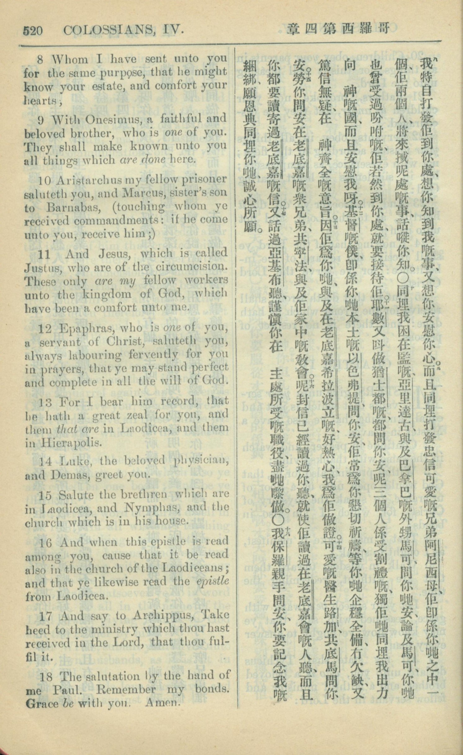 1909年中西字新約全書 歌羅西書 4 章 8 節到 4 章 18 節