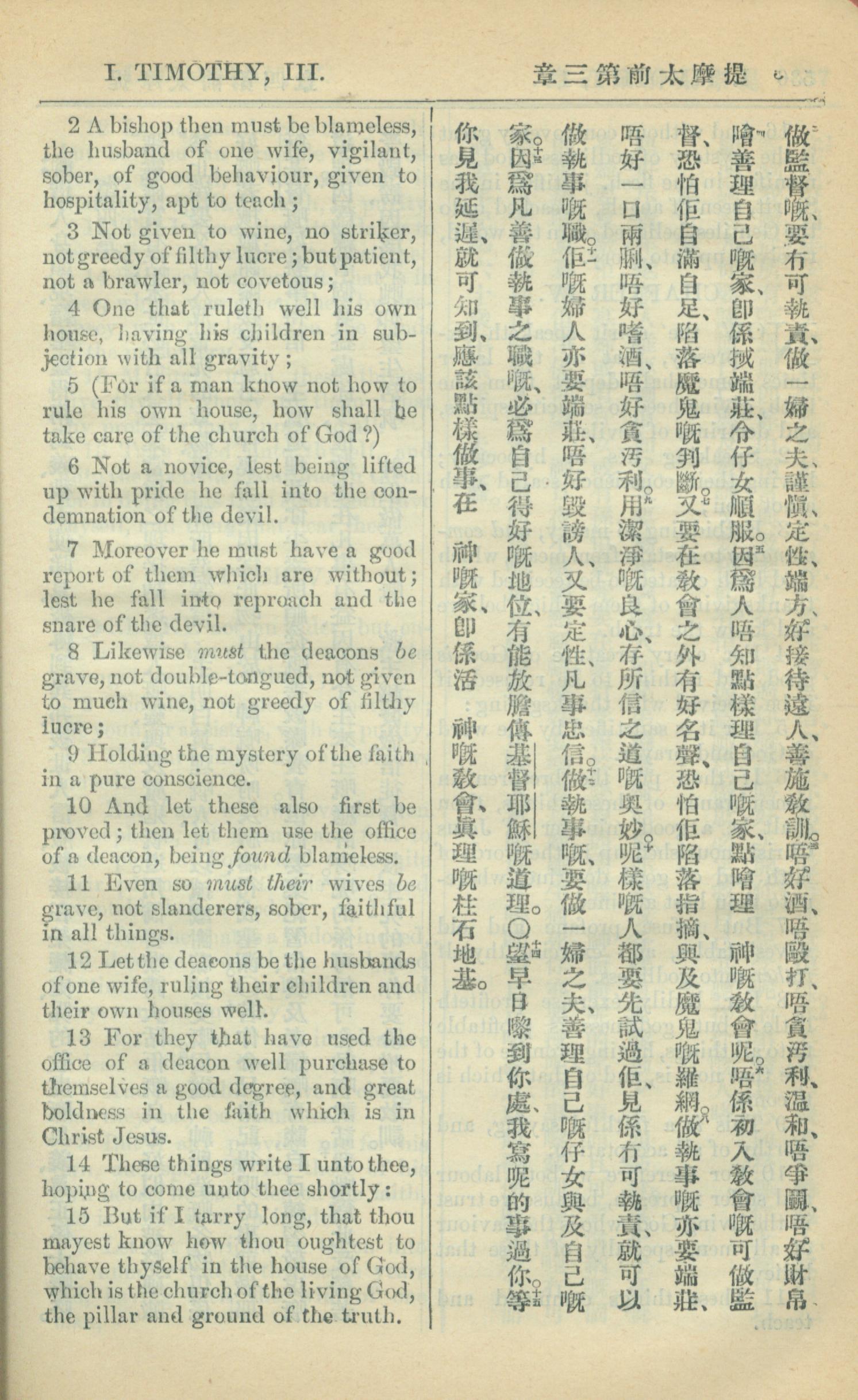 1909年中西字新約全書 提摩太前書 3 章 2 節到 3 章 15 節