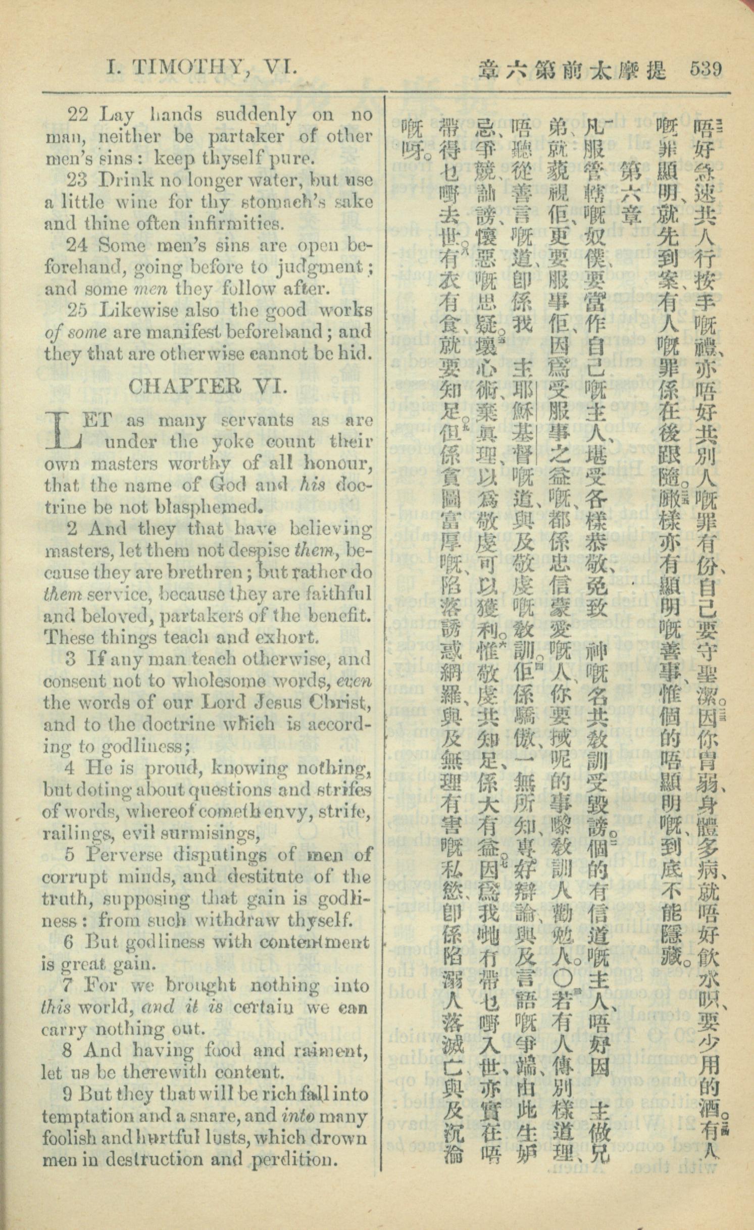 1909年中西字新約全書 提摩太前書 5 章 22 節到 6 章 9 節