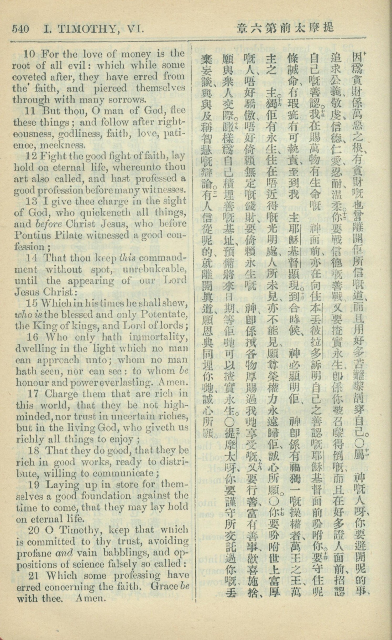 1909年中西字新約全書 提摩太前書 6 章 10 節到 6 章 21 節