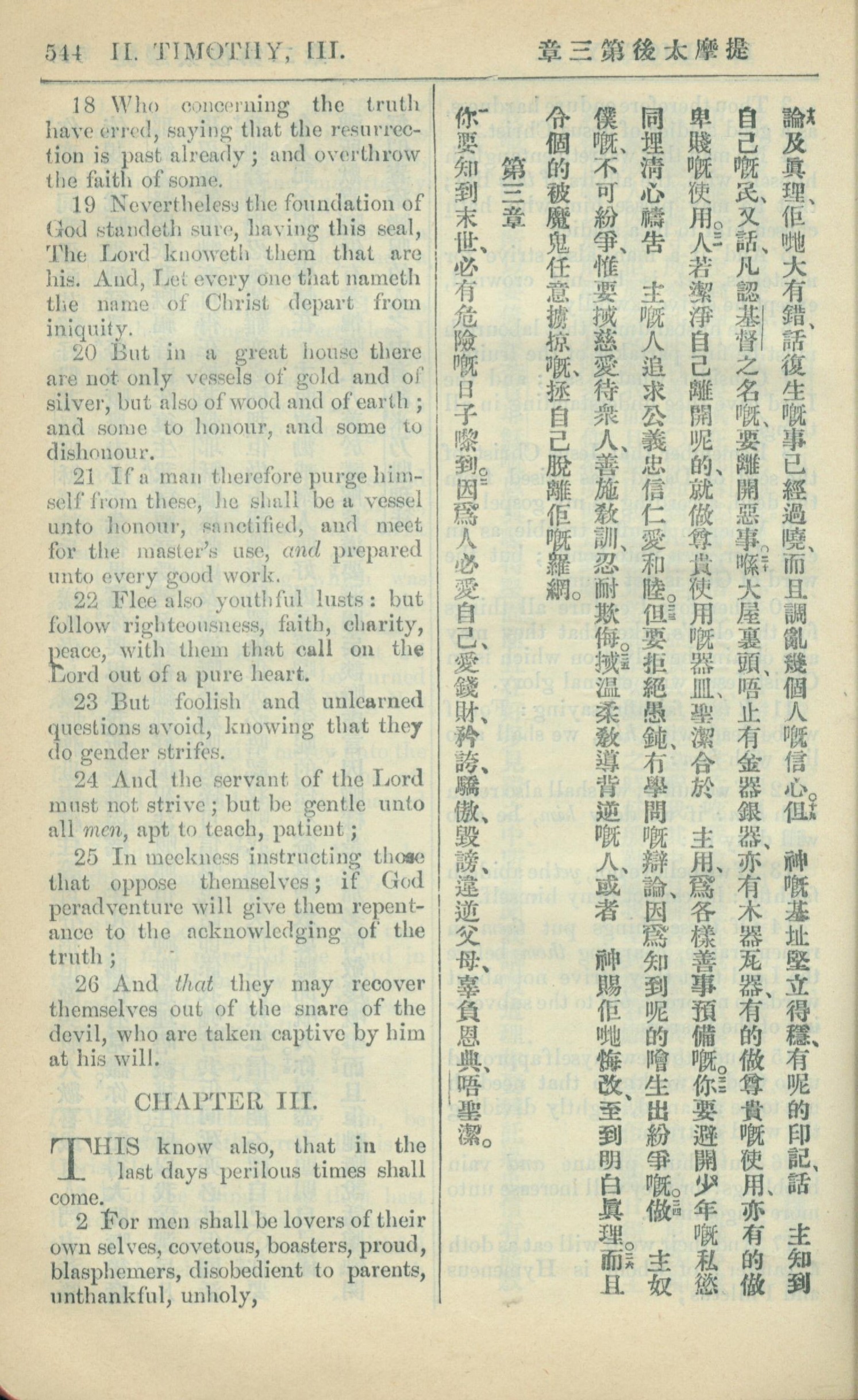 1909年中西字新約全書 提摩太後書 2 章 18 節到 3 章 2 節