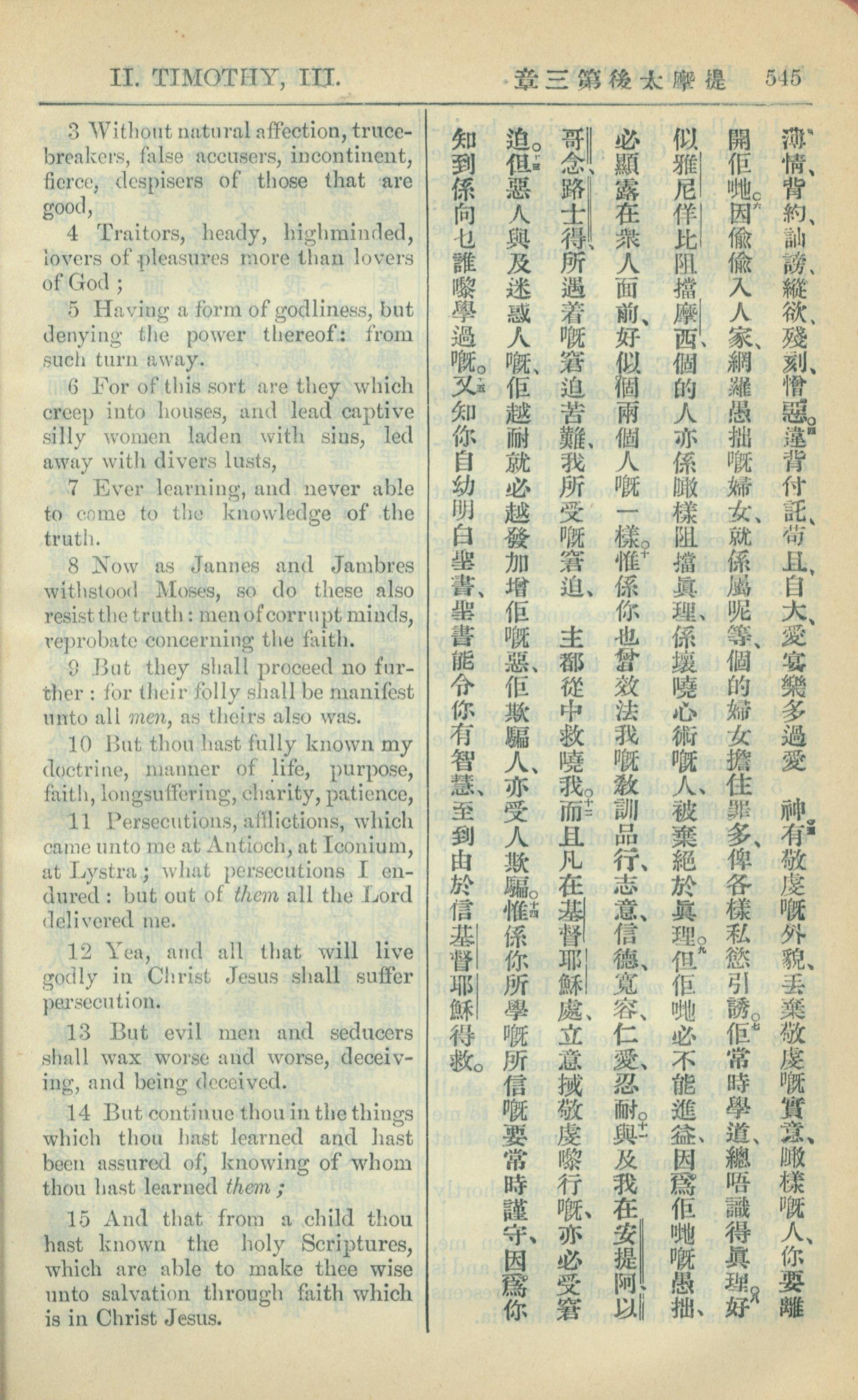 1909年中西字新約全書 提摩太後書 3 章 3 節到 3 章 15 節