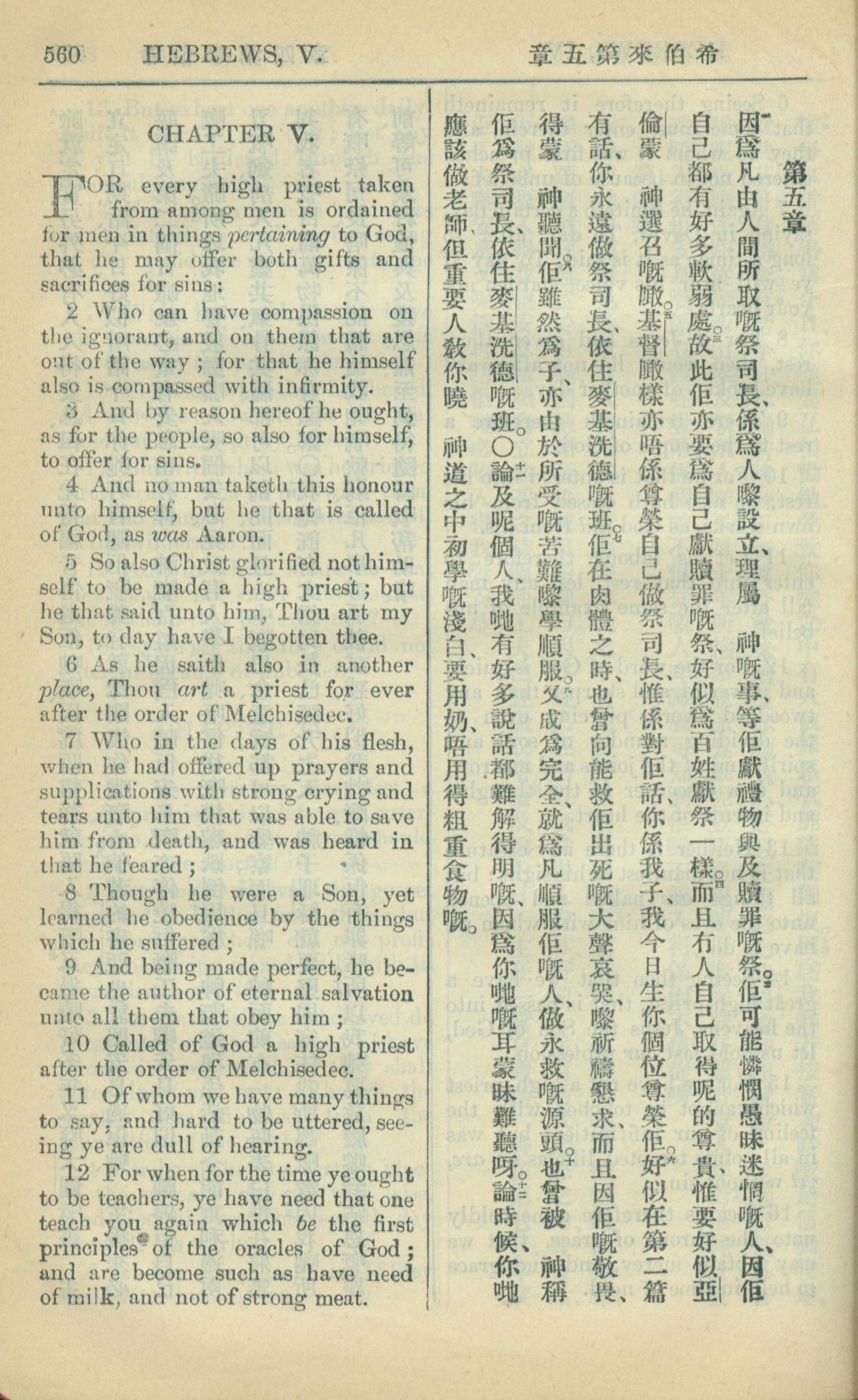 1909年中西字新約全書 希伯來書 5 章 1 節到 5 章 12 節