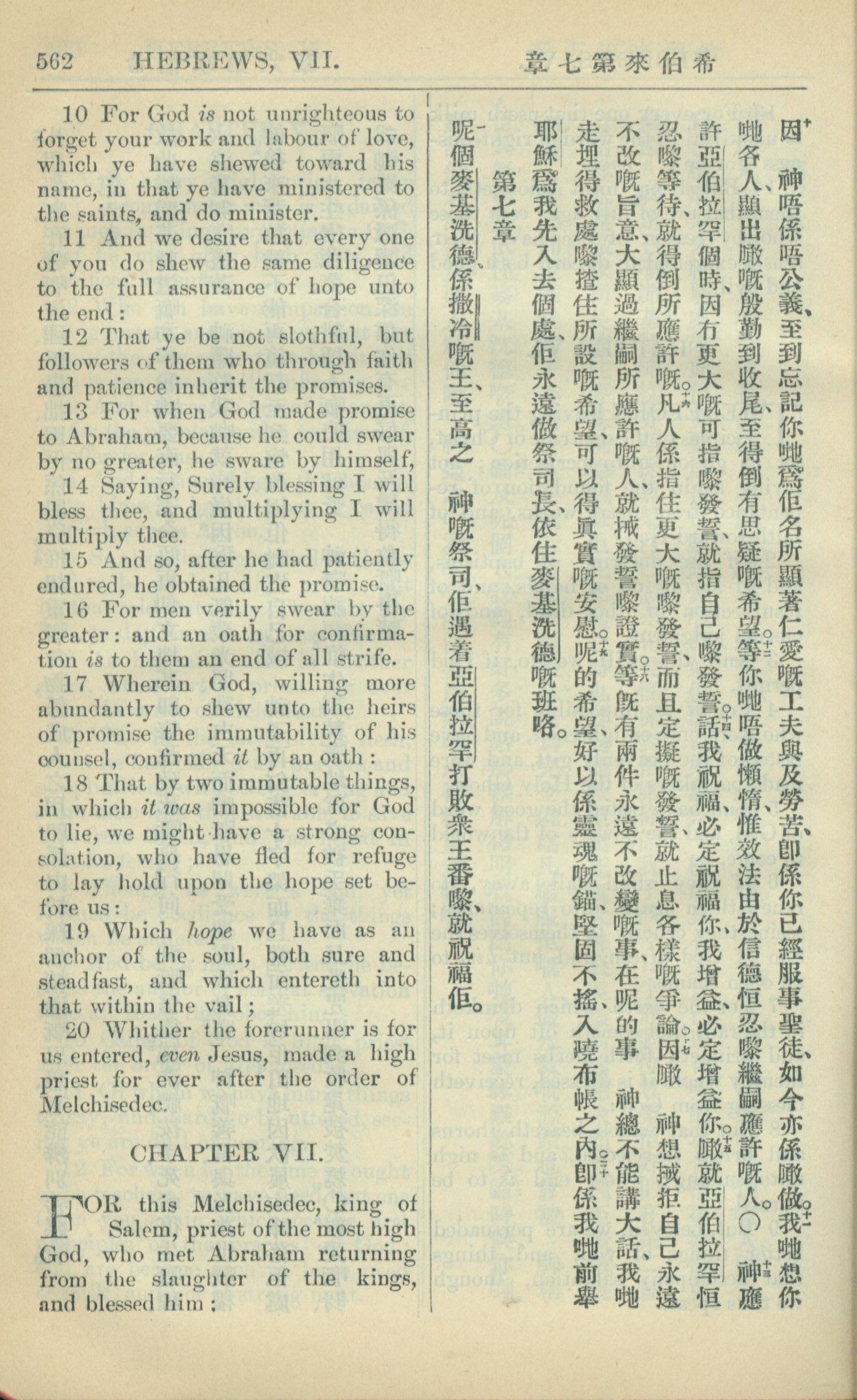 1909年中西字新約全書 希伯來書 6 章 10 節到 7 章 1 節