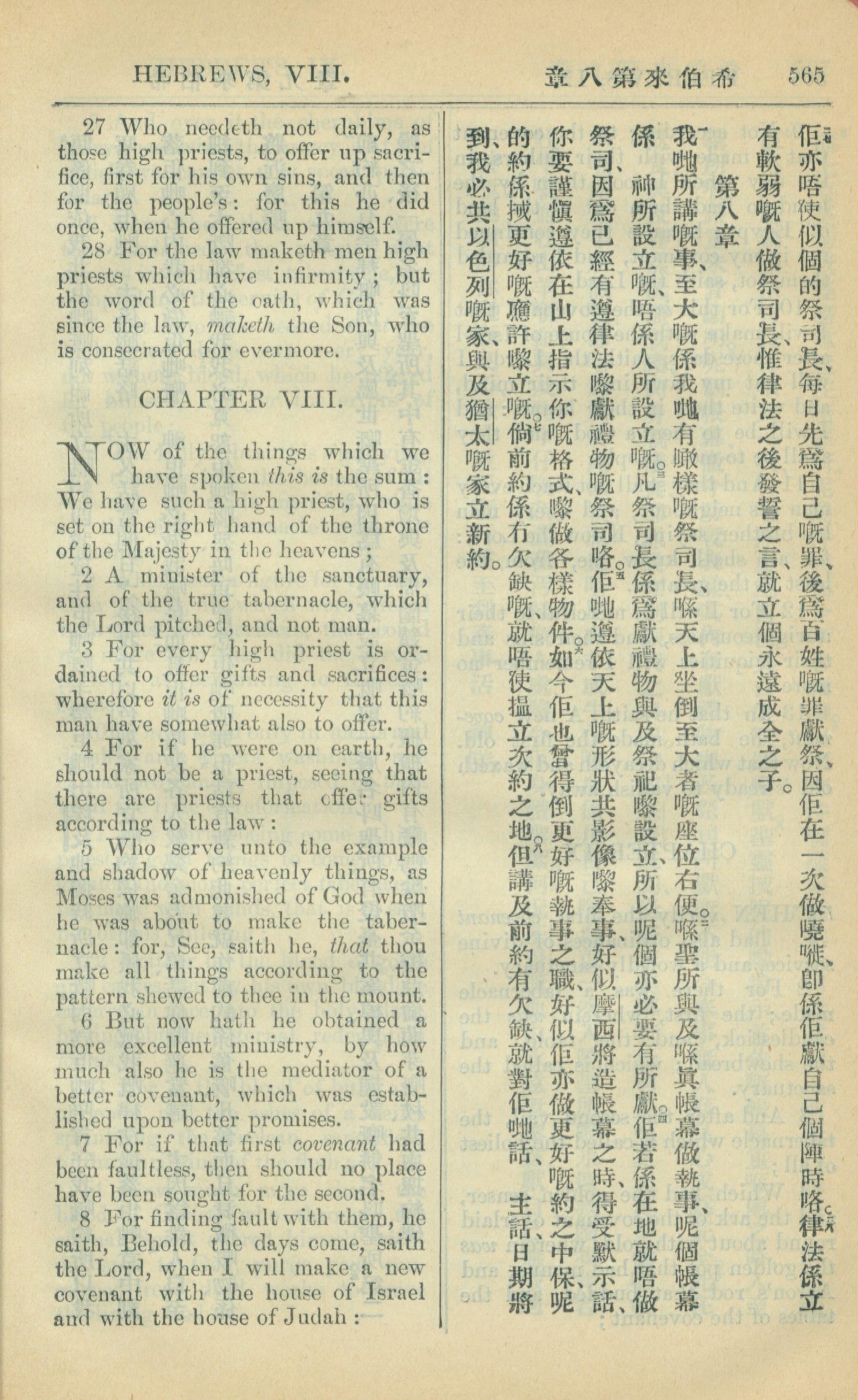 1909年中西字新約全書 希伯來書 7 章 27 節到 8 章 8 節
