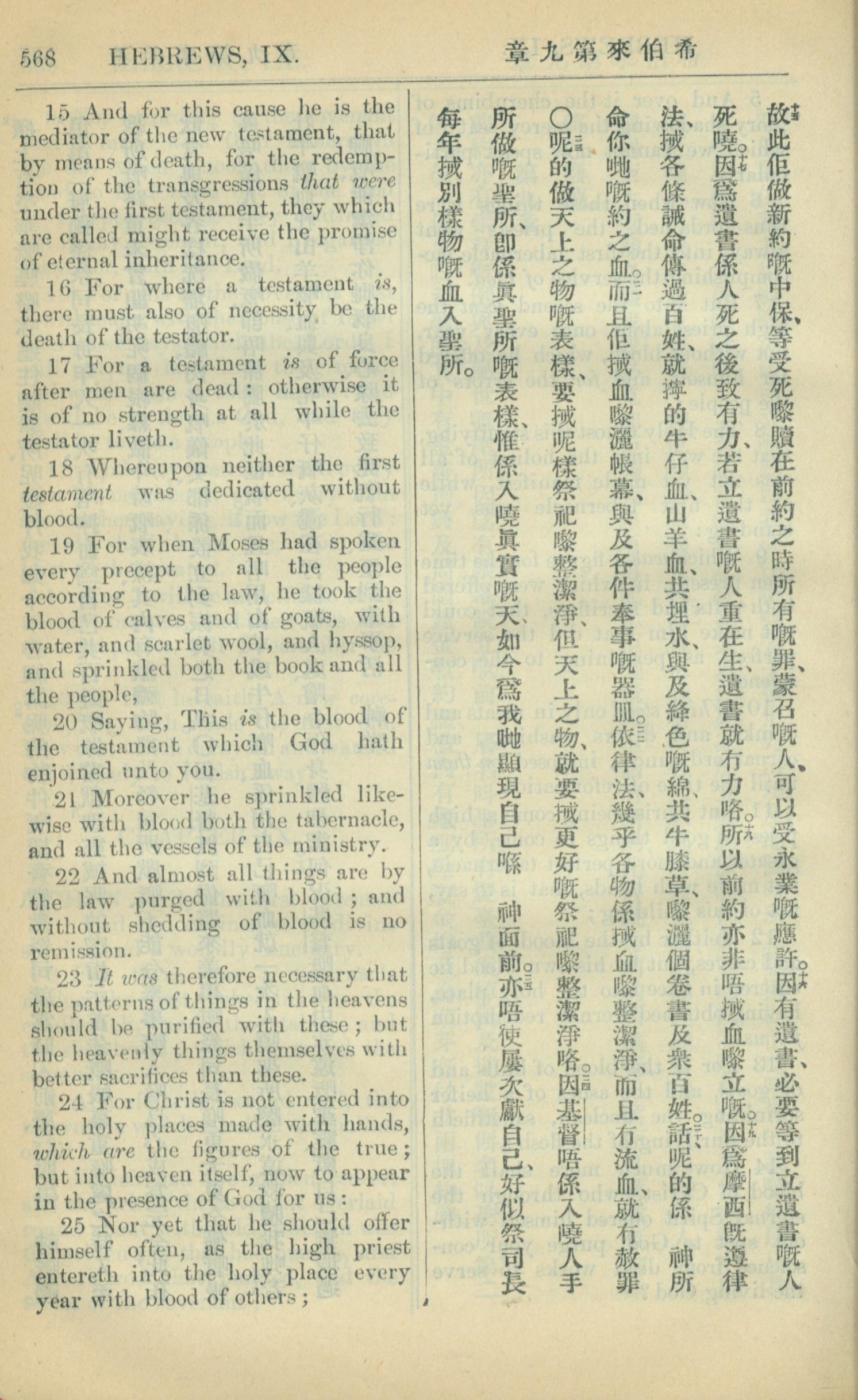 1909年中西字新約全書 希伯來書 9 章 15 節到 9 章 25 節