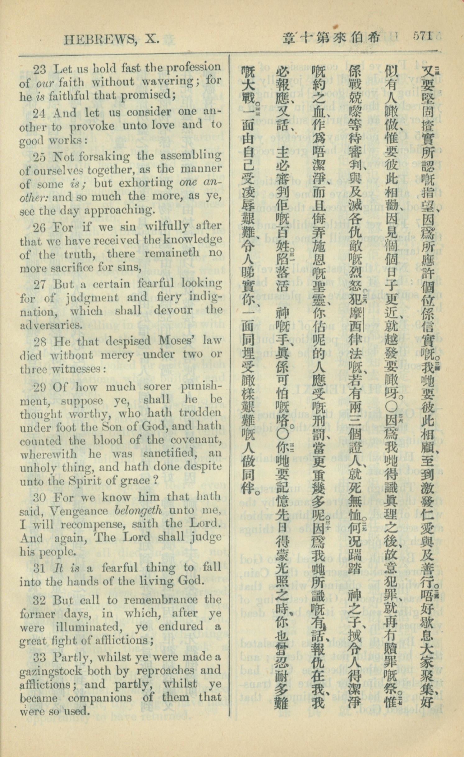 1909年中西字新約全書 希伯來書 10 章 23 節到 10 章 33 節
