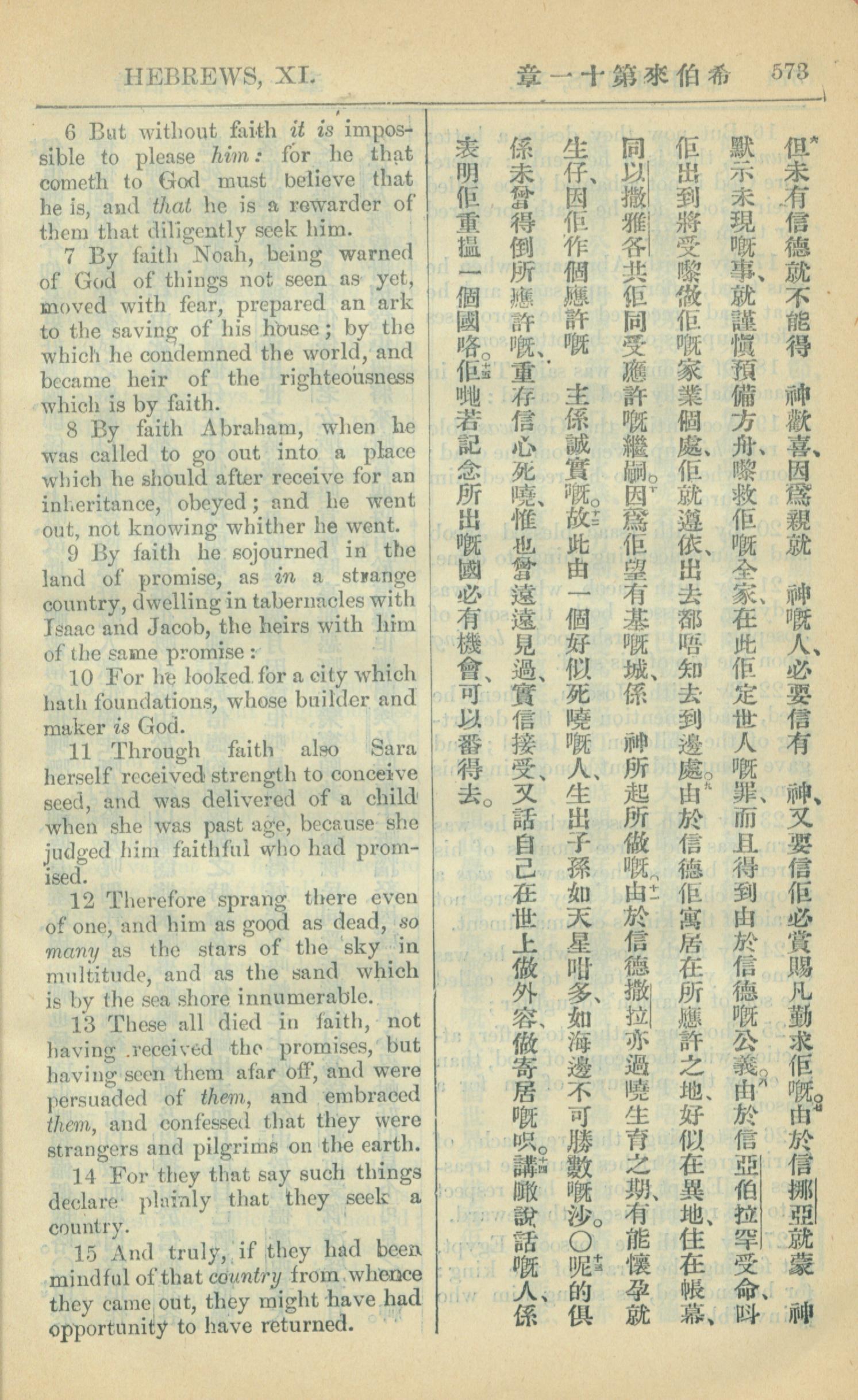 1909年中西字新約全書 希伯來書 11 章 6 節到 11 章 15 節